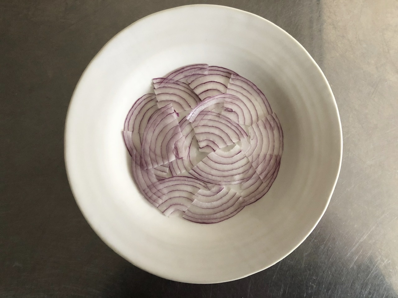 紫玉葱を繊維に逆らって薄切りにし、器にしきつめる。