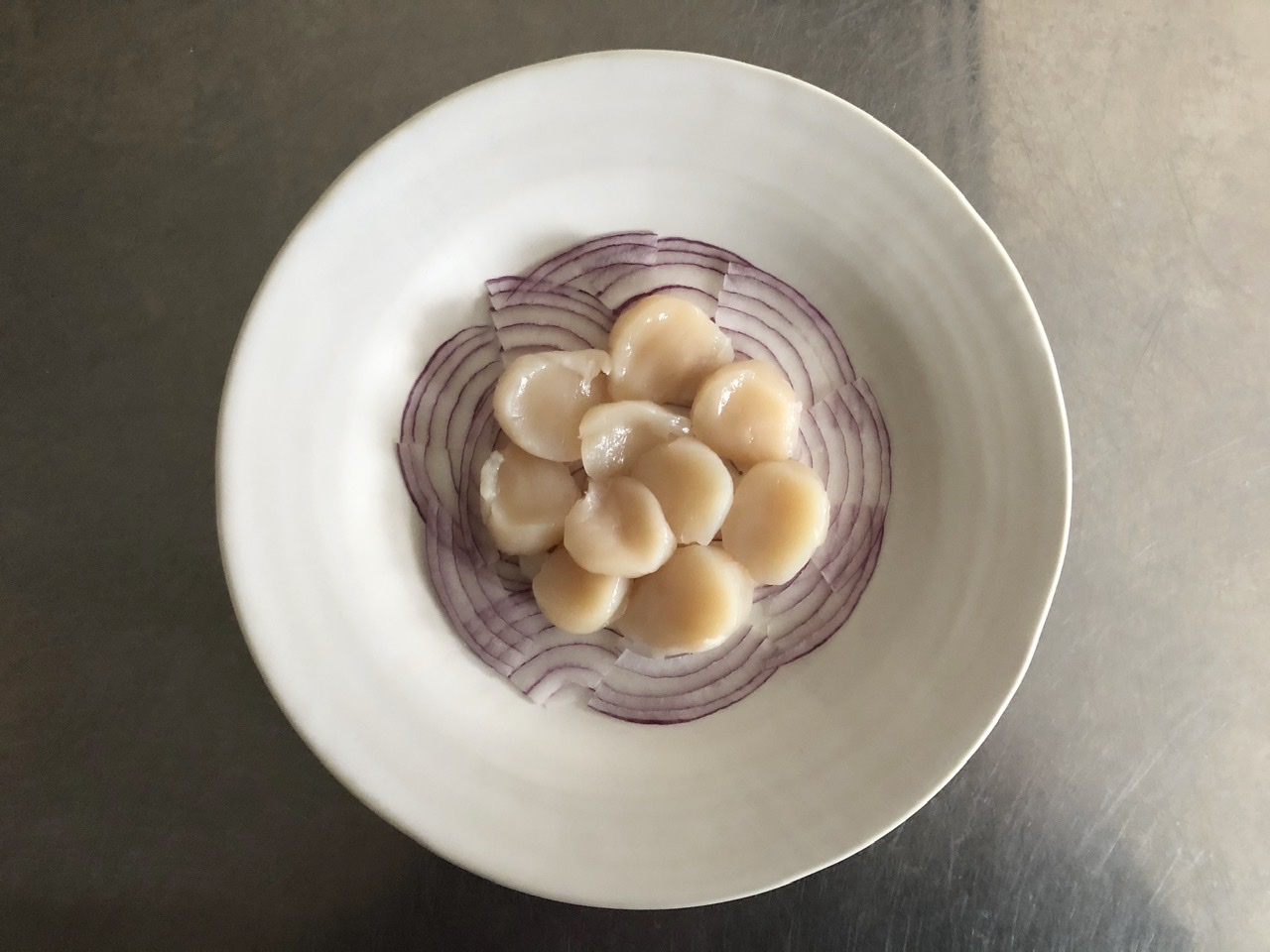 ホタテは厚み半分に切り、中央に丸く並べる。