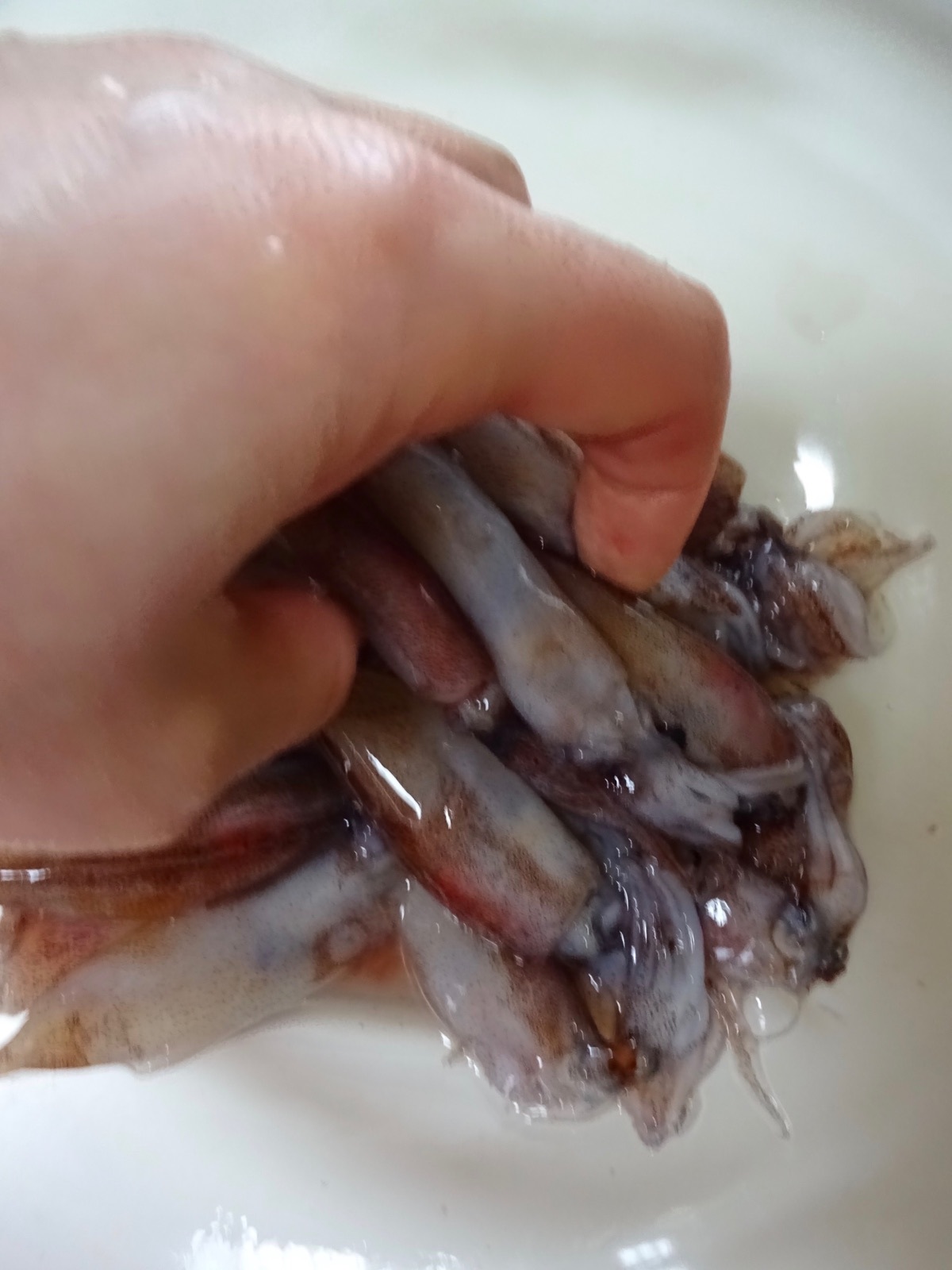 【下準備】生ホタルイカの目と口を取り除く。にんにくはみじん切りにする。