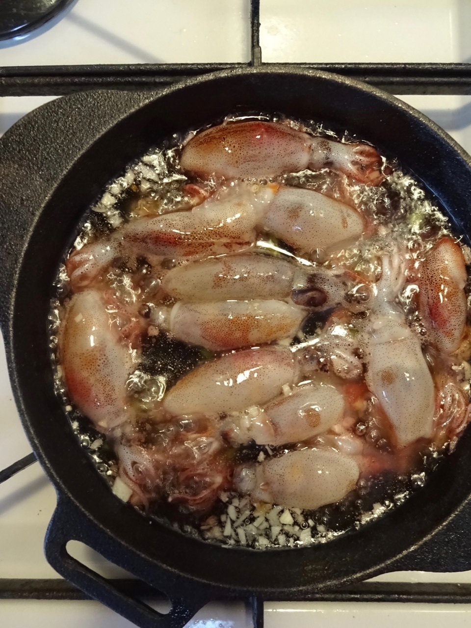 スキレットに菜種油と実山椒、にんにくを入れて弱火にかけ、にんにくの香りが立ってきたら生ホタルイカを加える。