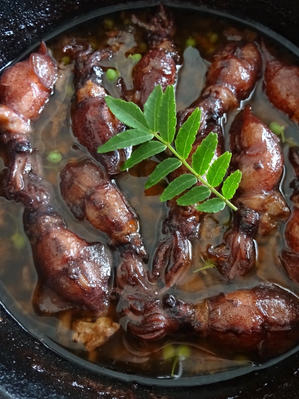 - 生ホタルイカを上下返しながら火が通るまで約8分煮る。