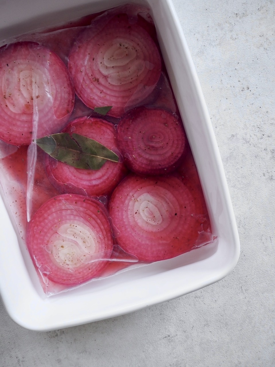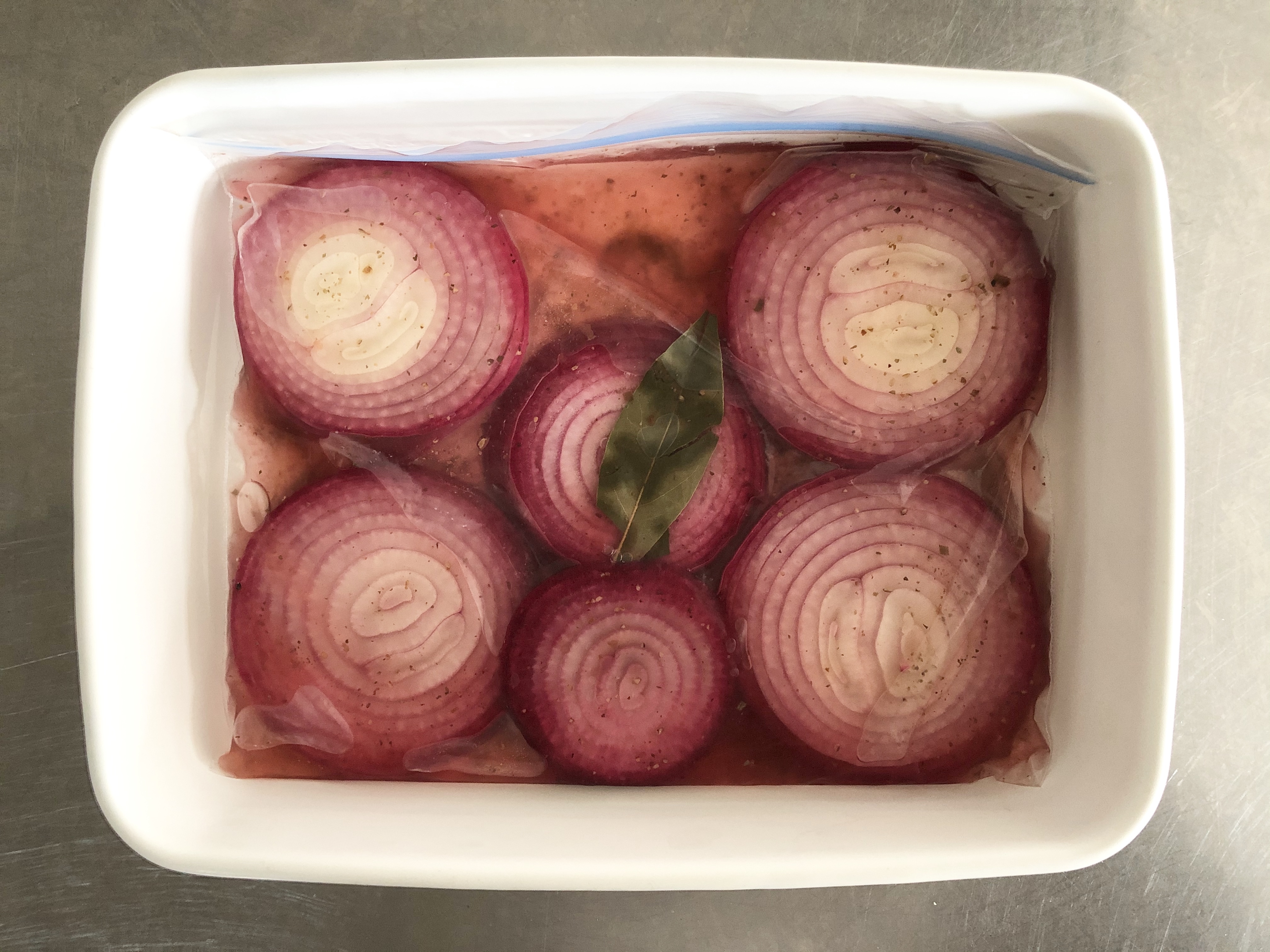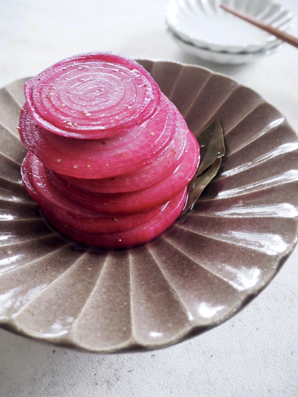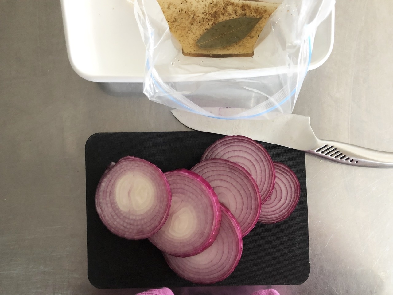 赤玉ねぎを繊維に逆らって1cm幅に切ります