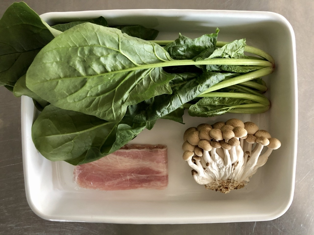 ベーコンはおいしい脂をじっくり引き出して、しめじは旨味を逃さないようあまり触らず時々あおる程度に炒め、ほうれん草は色よく仕上がるように手早く炒め合わせる。