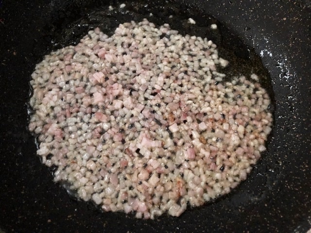 フライパンにオリーブオイルとベーコンを入れて加熱する。(弱中火)