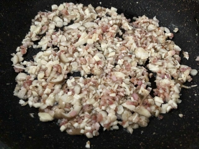 ベーコンから脂が出てきたら、しめじを加えさっと絡め