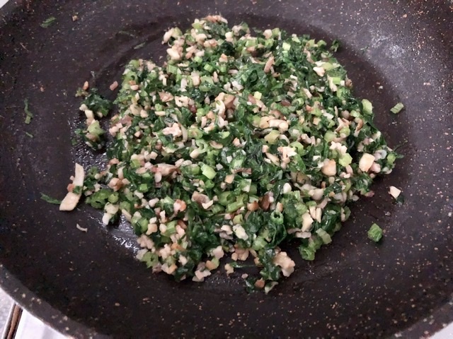 しめじがややしんなりとしてきたらほうれん草を加え手早く炒め、ガーリックソルトで味を整える。(強火)