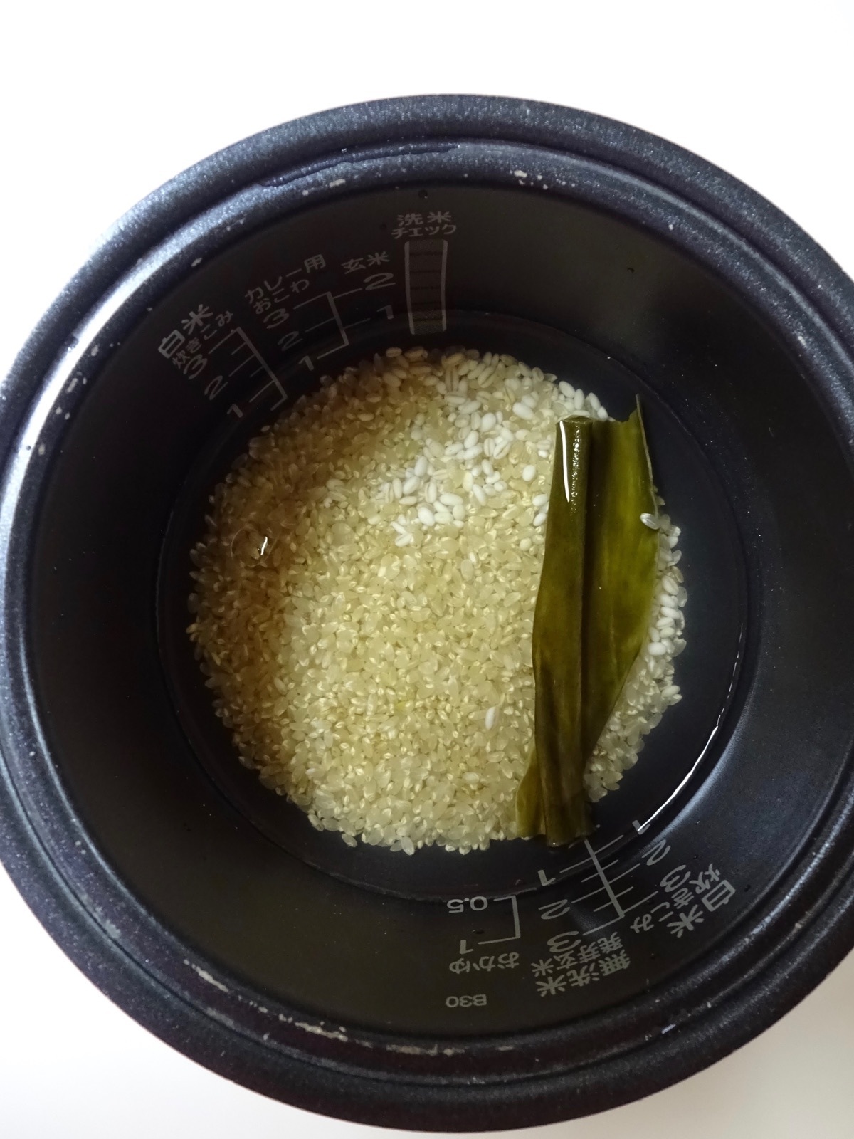 【下準備】玄米を軽くゆすいで水気を切り、炊飯釜にもち麦と一緒に入れて出汁昆布と水を加えて3時間置く。