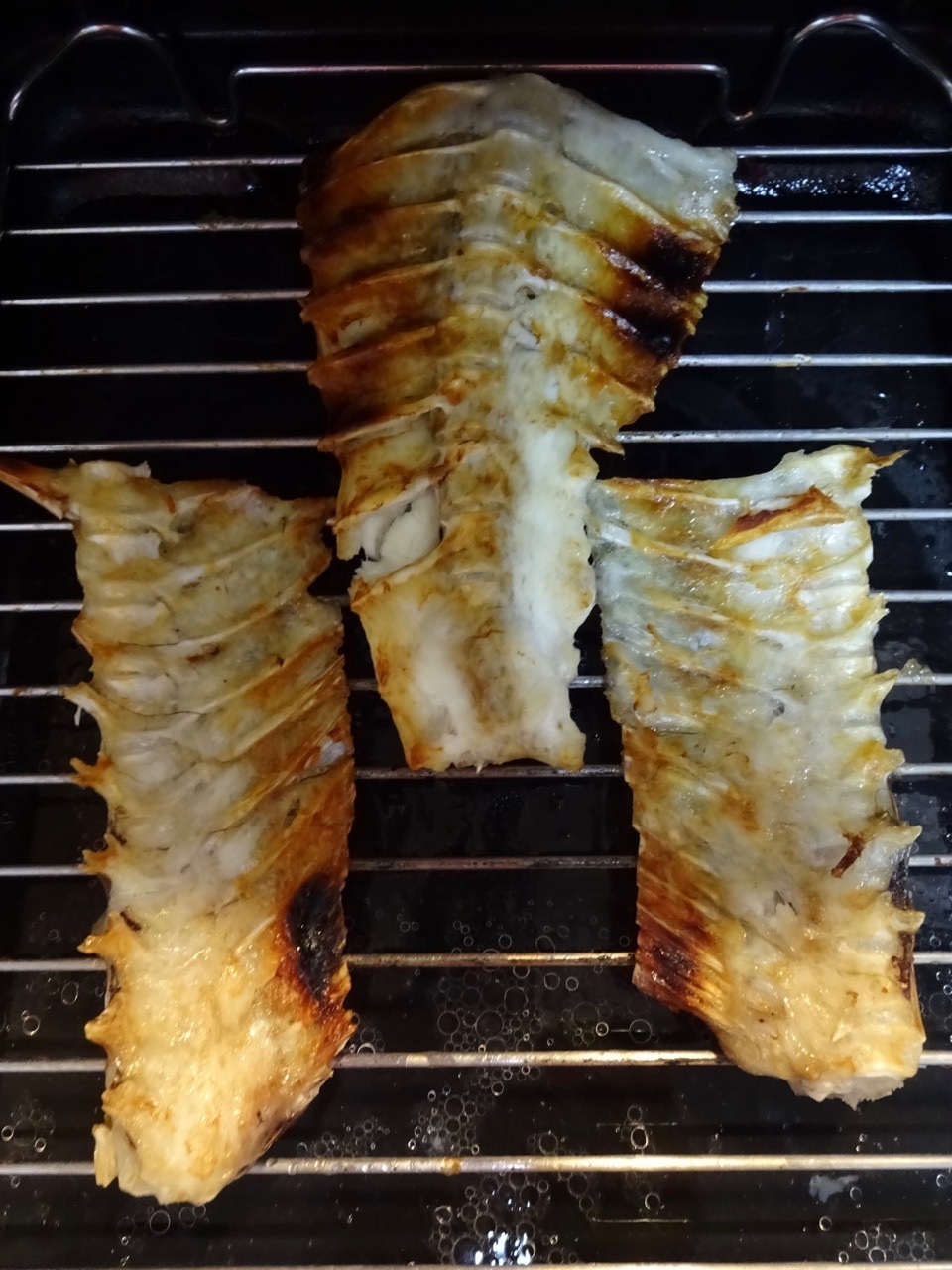 魚焼きグリルを中火で熱して網を温め、2の水気と血などをキッチンペーパーで丁寧に拭い、グリルの火を一旦止めて鯛の中落ちを入れて強めの中火にかけ、表面に焼き色が付き火が通るまで焼く。