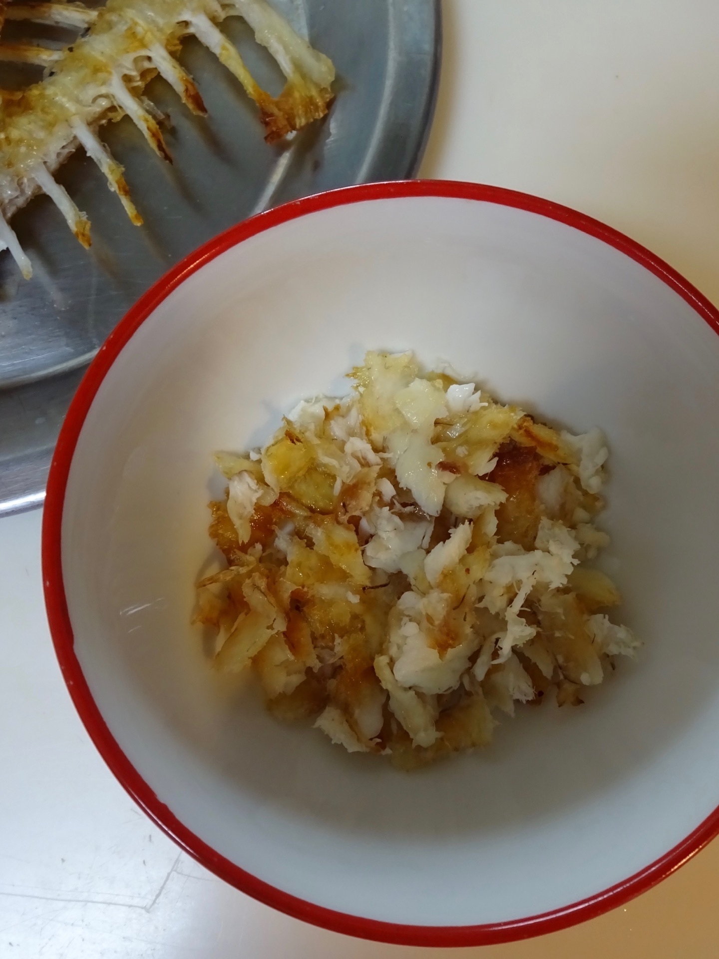 3の粗熱が取れたら骨から身を取り、ラップをして置いておく。