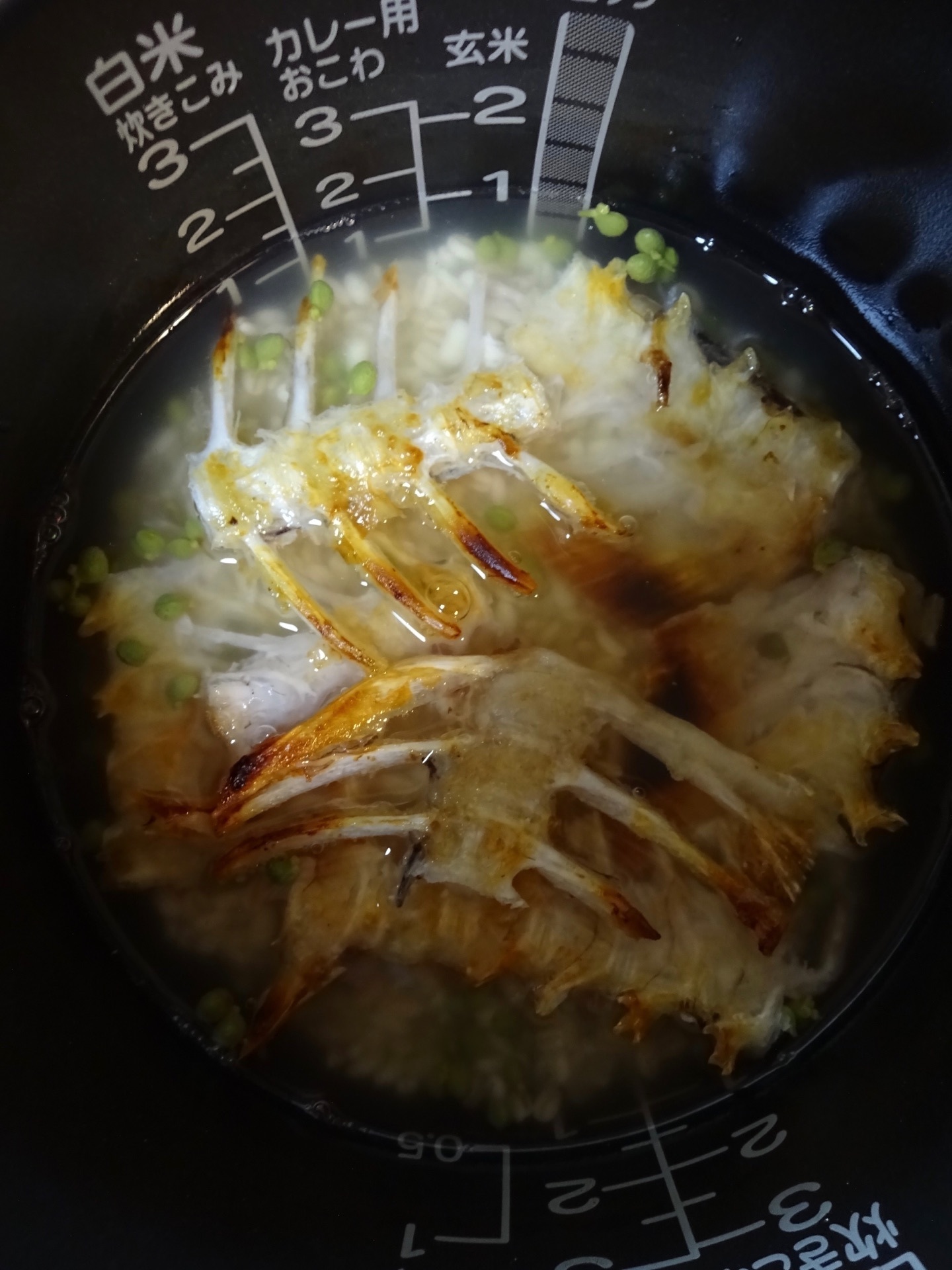 1の昆布を取り出し実山椒とAを入れて軽く混ぜ合わせ、4の骨を加えて炊飯する。