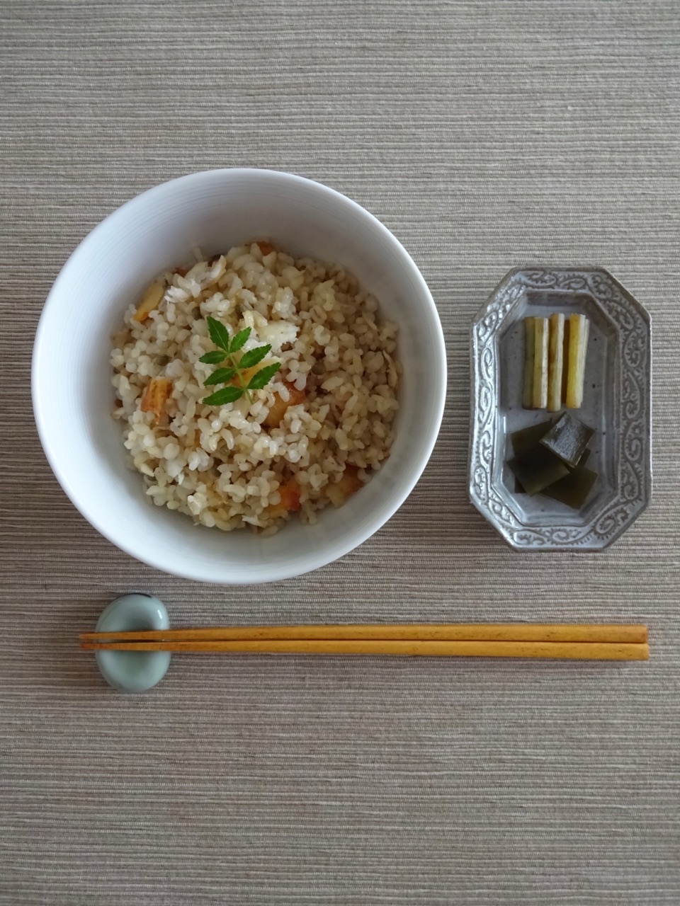 鯛の中落ちを焼いて身をほぐした後の骨と実山椒で玄米を炊いた後、旨味の詰まった鯛の身を混ぜ込んだ風味豊かな炊き込みご飯です。