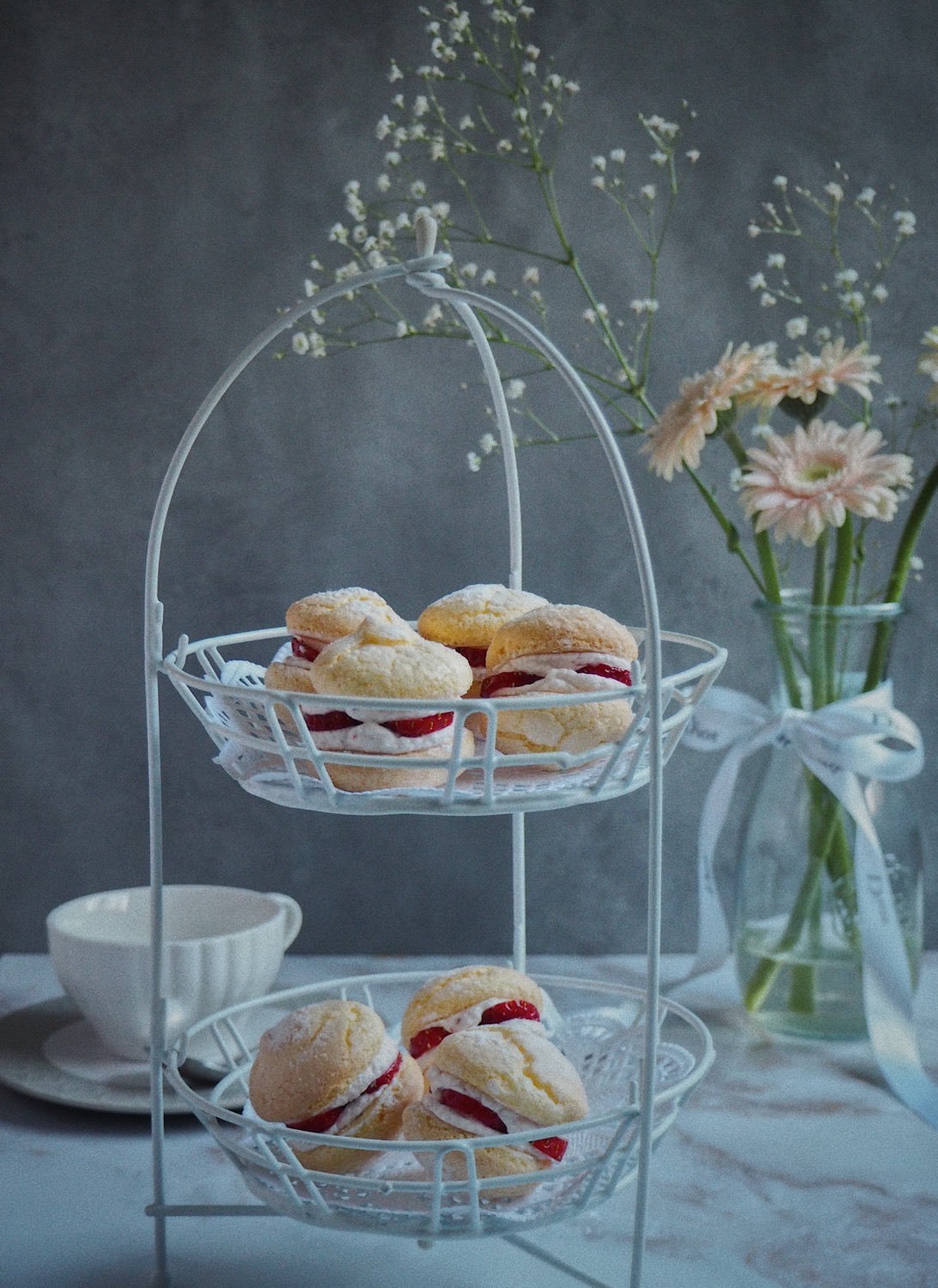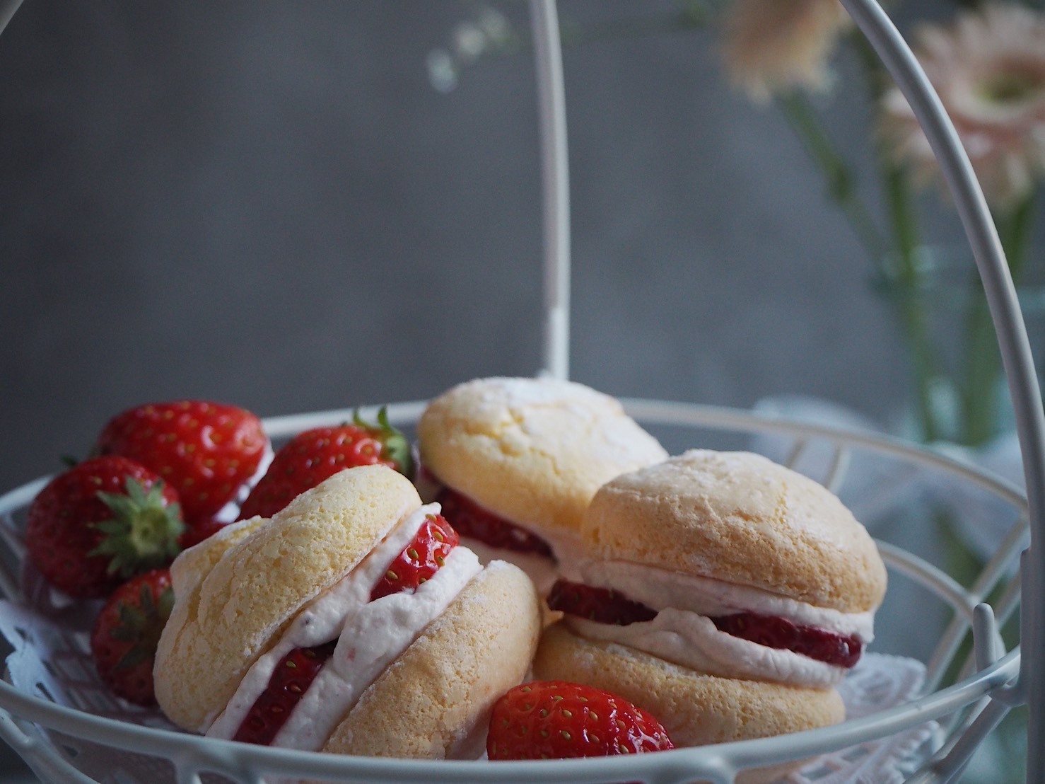 - 焼けた5に6のクリームと苺を入れて、サンドして完成。