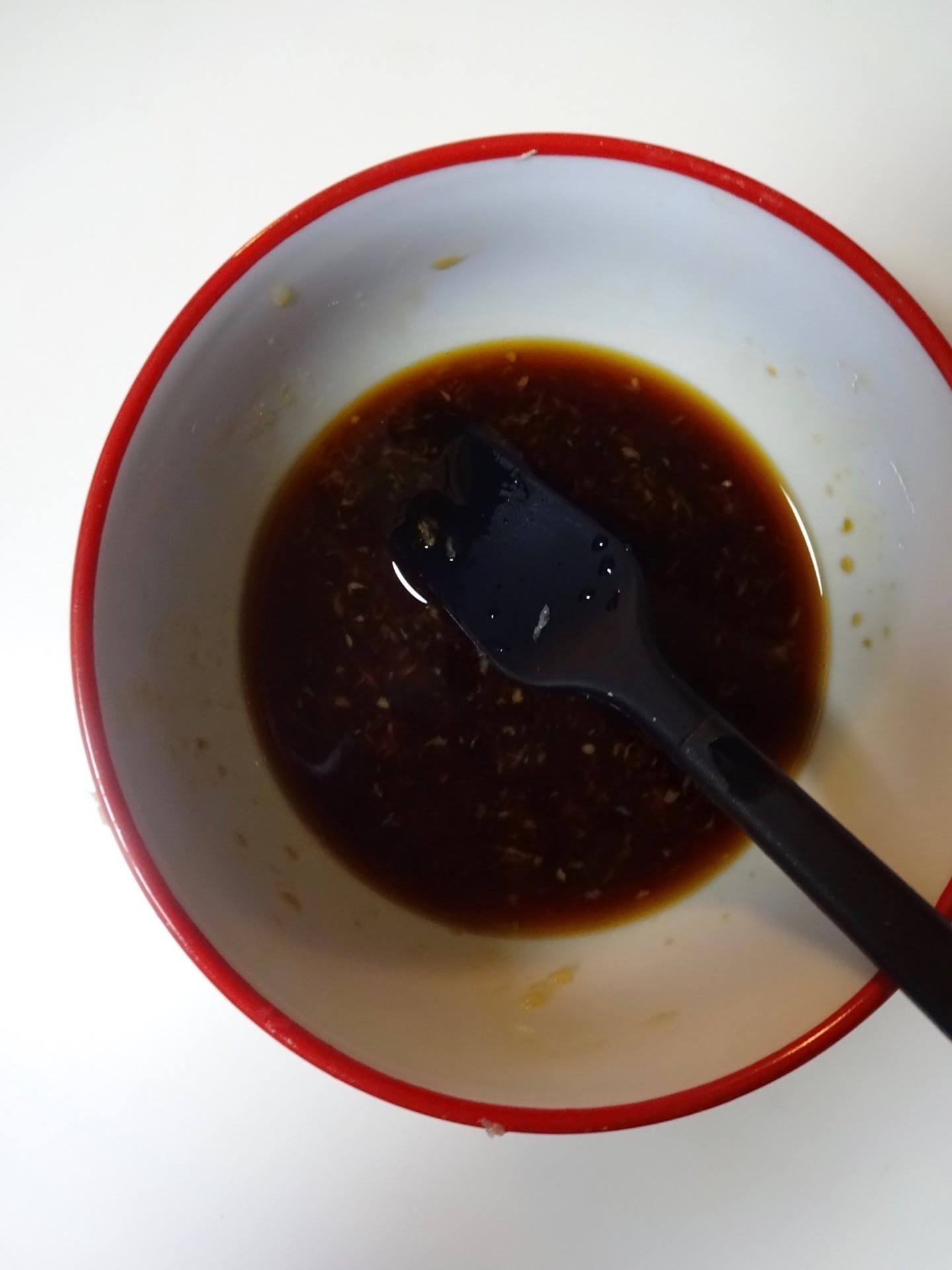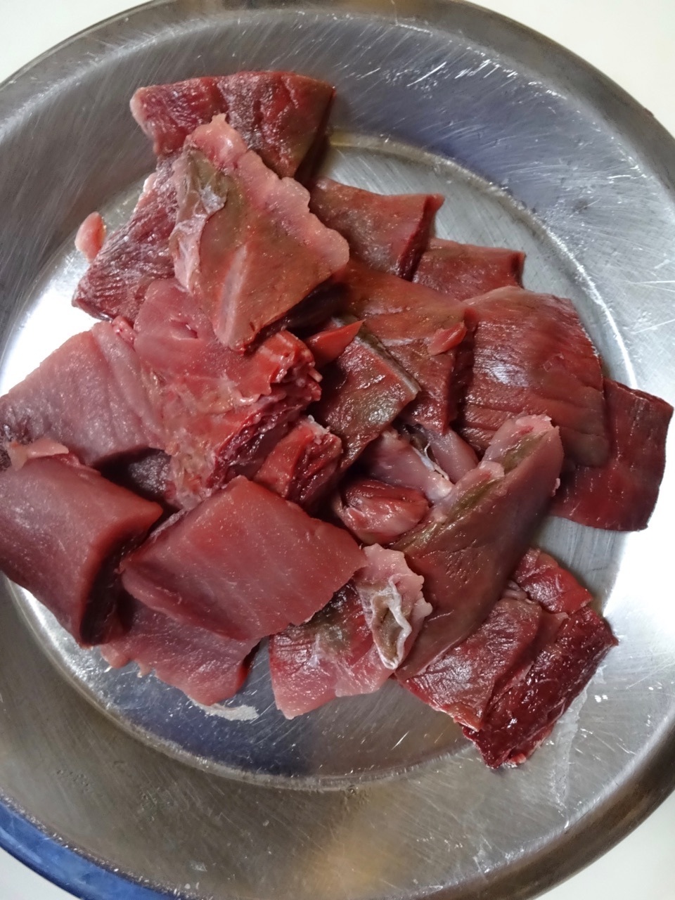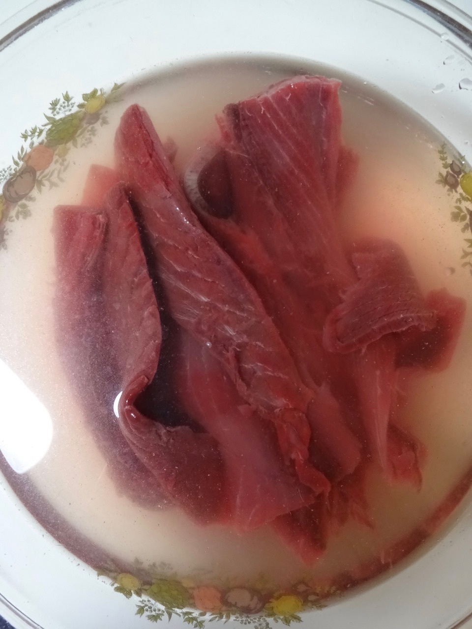 【下準備】マグロ血合いをボールに入れて水を注ぎ、10分おきに水を換えて水が濁らなくなるまで30~40分浸ける。