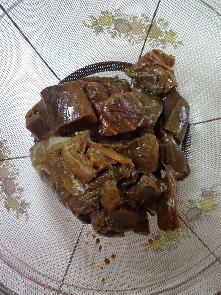 【下準備】1の水気と血などの汚れをクッキングペーパーで拭き取り、食べやすい大きさに切る。