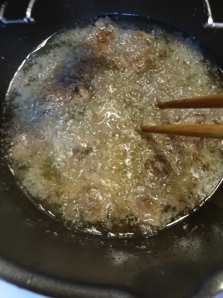 鍋に揚げ油を注いで中火にかけ、180度になったら5を数回に分けて入れ、火が通るまで約3分揚げる。