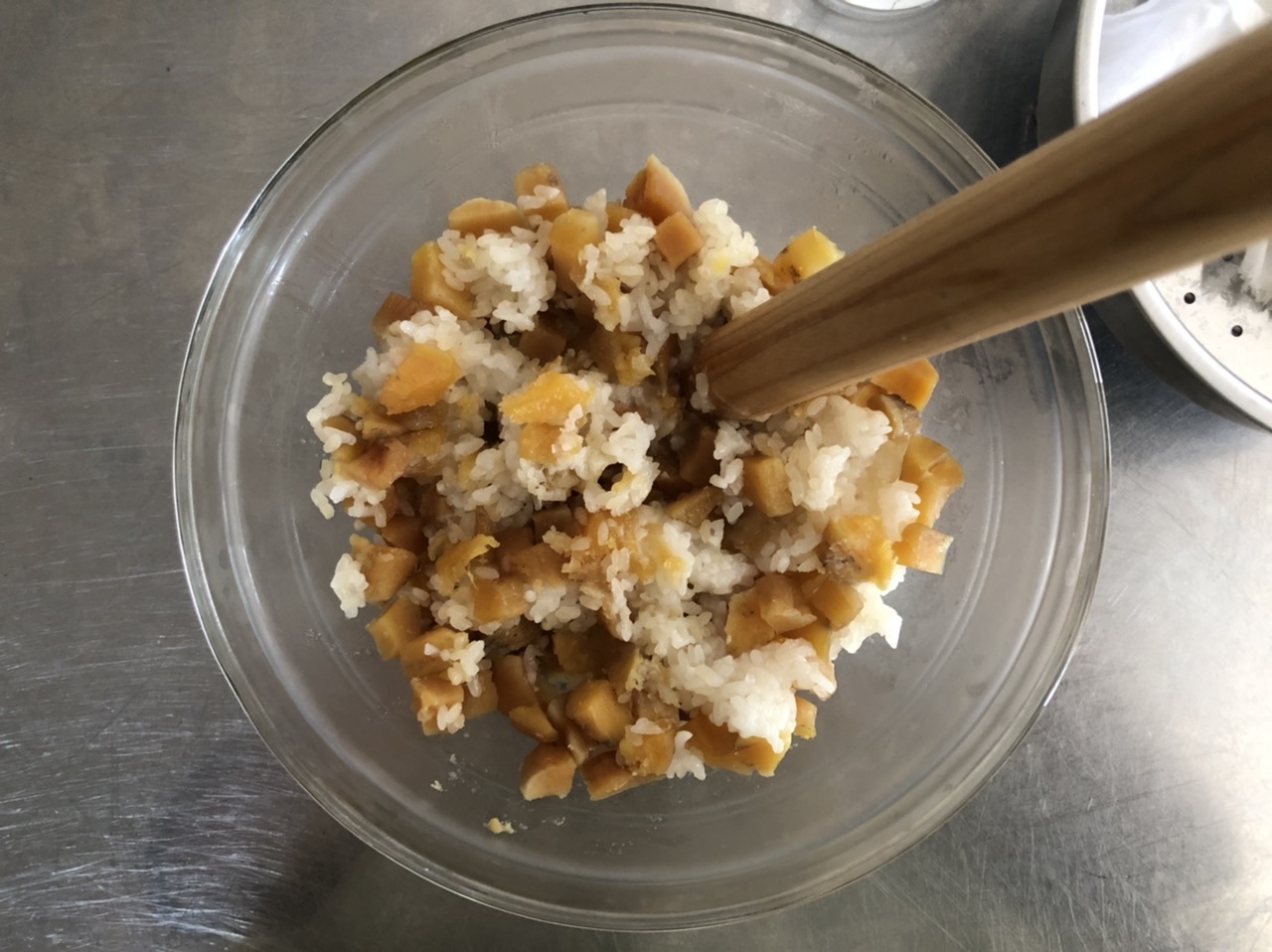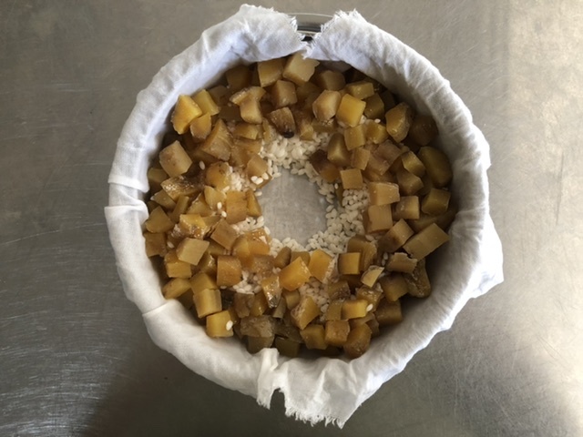 蒸し籠にさらしを敷き、もち米・干しいもの順に入れる。