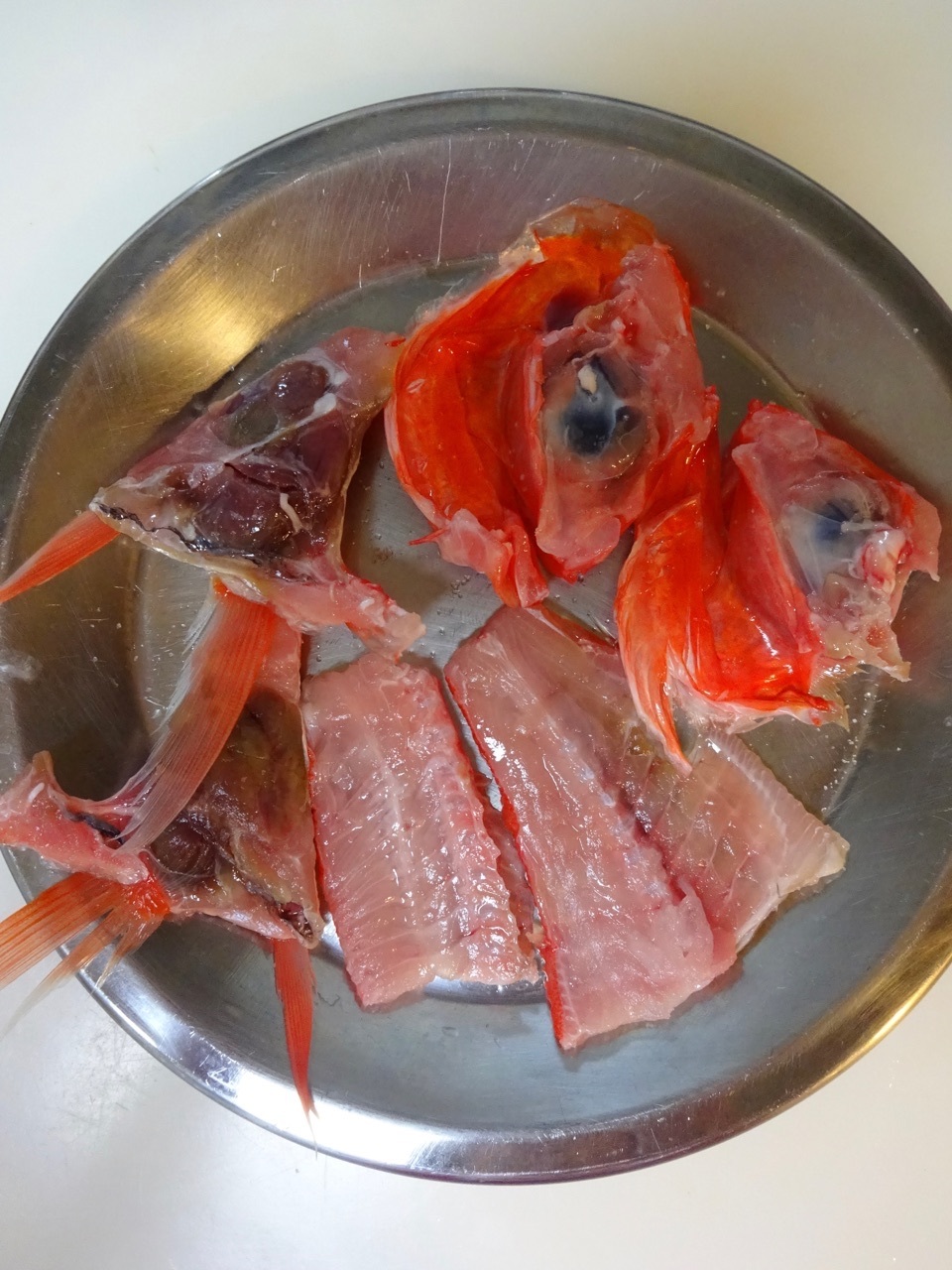 【下準備】金目鯛のアラを氷水で洗って血やうろこなどを取り除き、水気を拭いて塩を両面に振って置いておく。