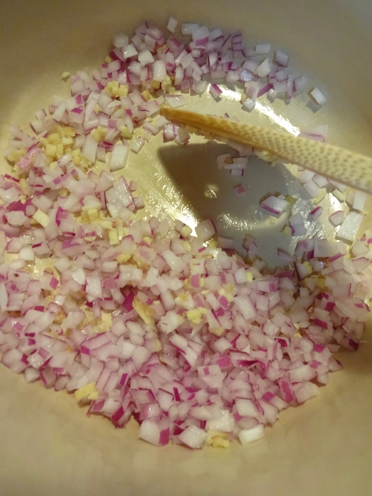 鍋に菜種油をひいて中火にかけ、にんにくと生姜を炒め、香りが立ったら玉ねぎを加え、玉ねぎが透き通るまで炒め合わせる。