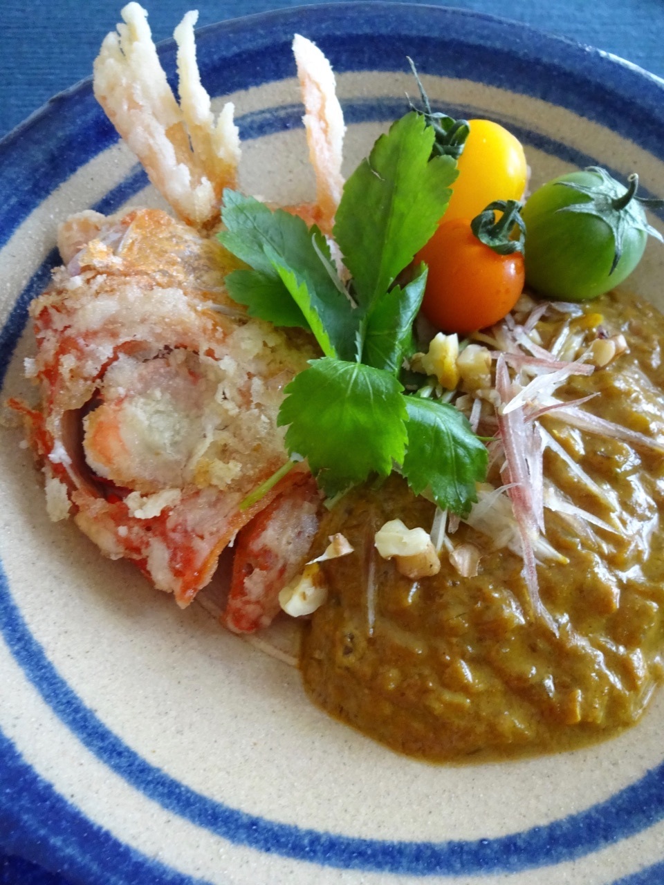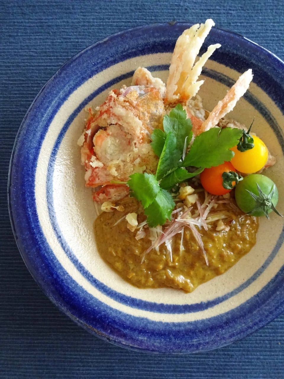 揚げた魚をメインディッシュにした和風のフィッシュカレー。カレーは味噌・しょっつる・鰹節・豆乳の和食材を主材料として作り、魚に合わせて生姜を効かせたレシピ。今回は金目鯛の頭などアラを使用いたしました。