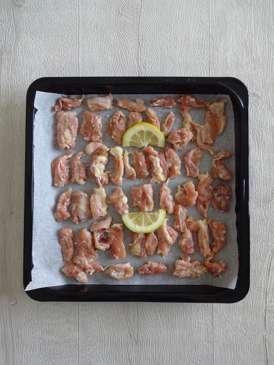 【下準備】オーブンを220℃に設定して余熱をかける。鶏セセリとレモンに付いた塩麹をキッチンペーパーで軽く拭い、オーブンに入れて火が通るまで15分焼く。