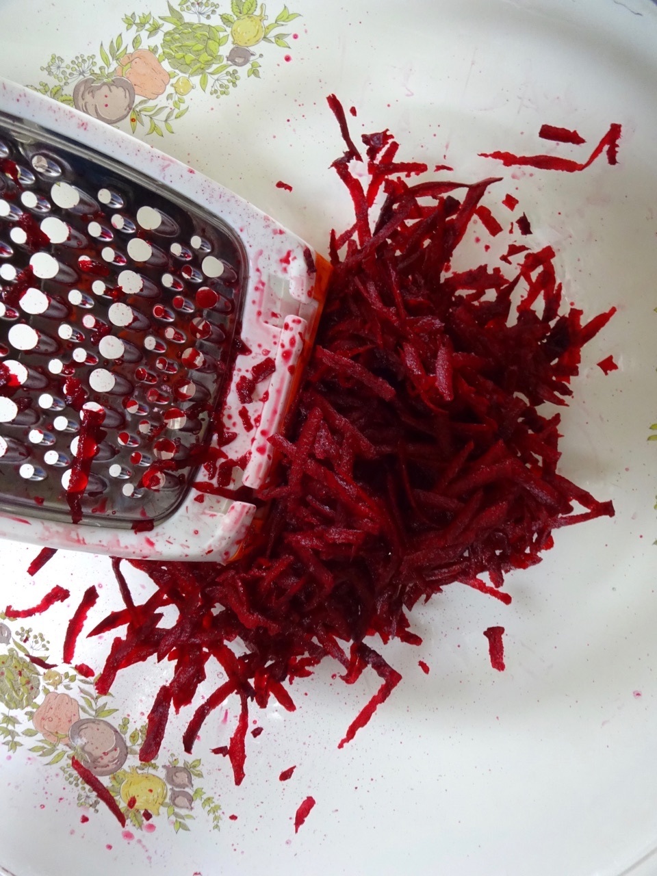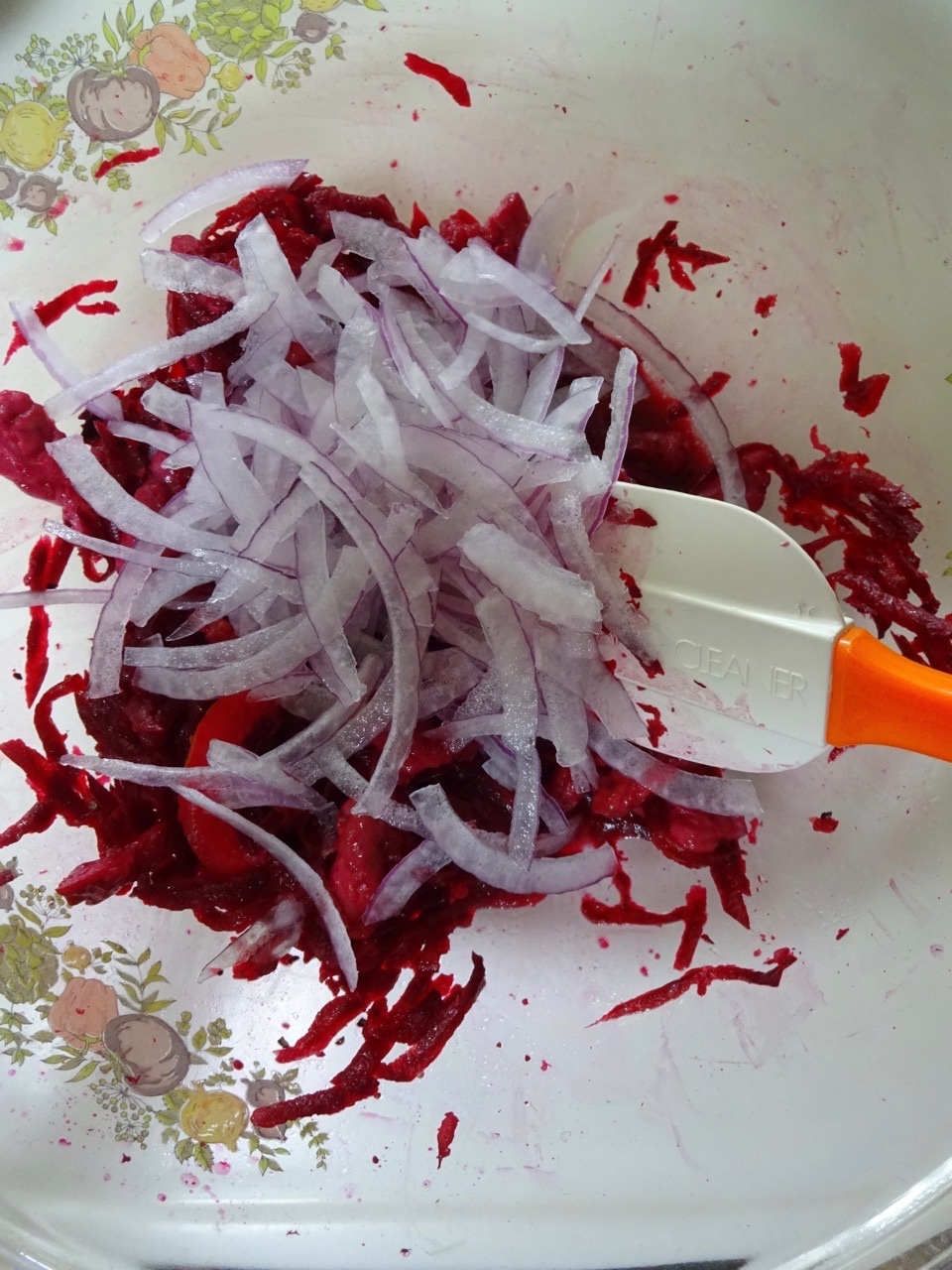ビーツの千切りはシリシリスライサーを使うと便利です。