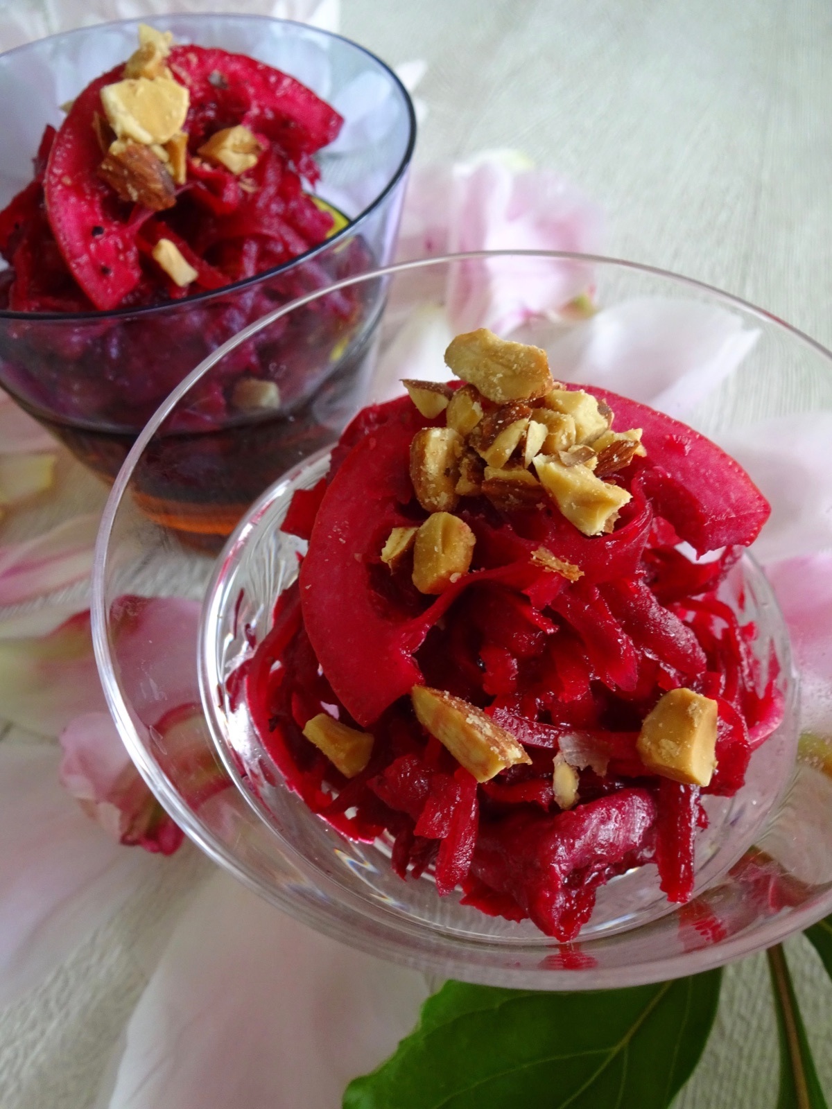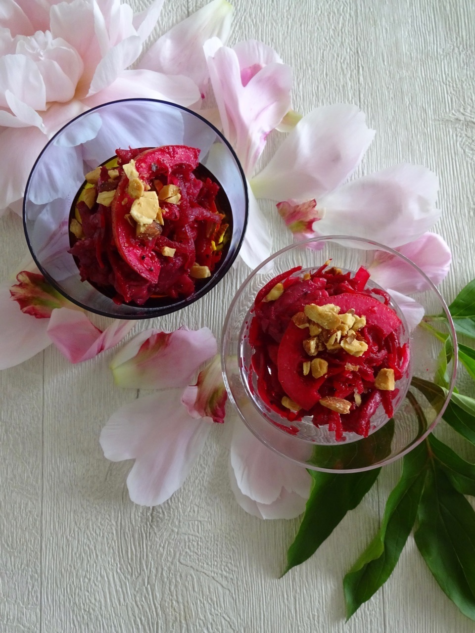 【下準備】ビーツは皮を剥き、3〜4cm長の千切りにする。紫玉ねぎは横にしてスライサーにかけ、水に10分さらして水気を切る。アーモンドは約0.5cm大に砕く。
