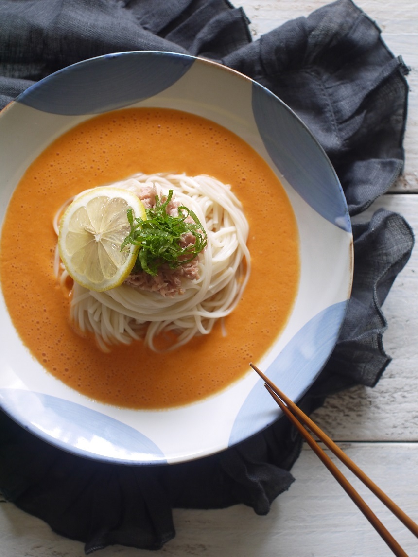 いつものひやむぎやそうめんを、トマトとめんつゆ、オリーブオイルをミキサーにかけて、冷製和風ポタージュでいただく、簡単アレンジ冷めん。