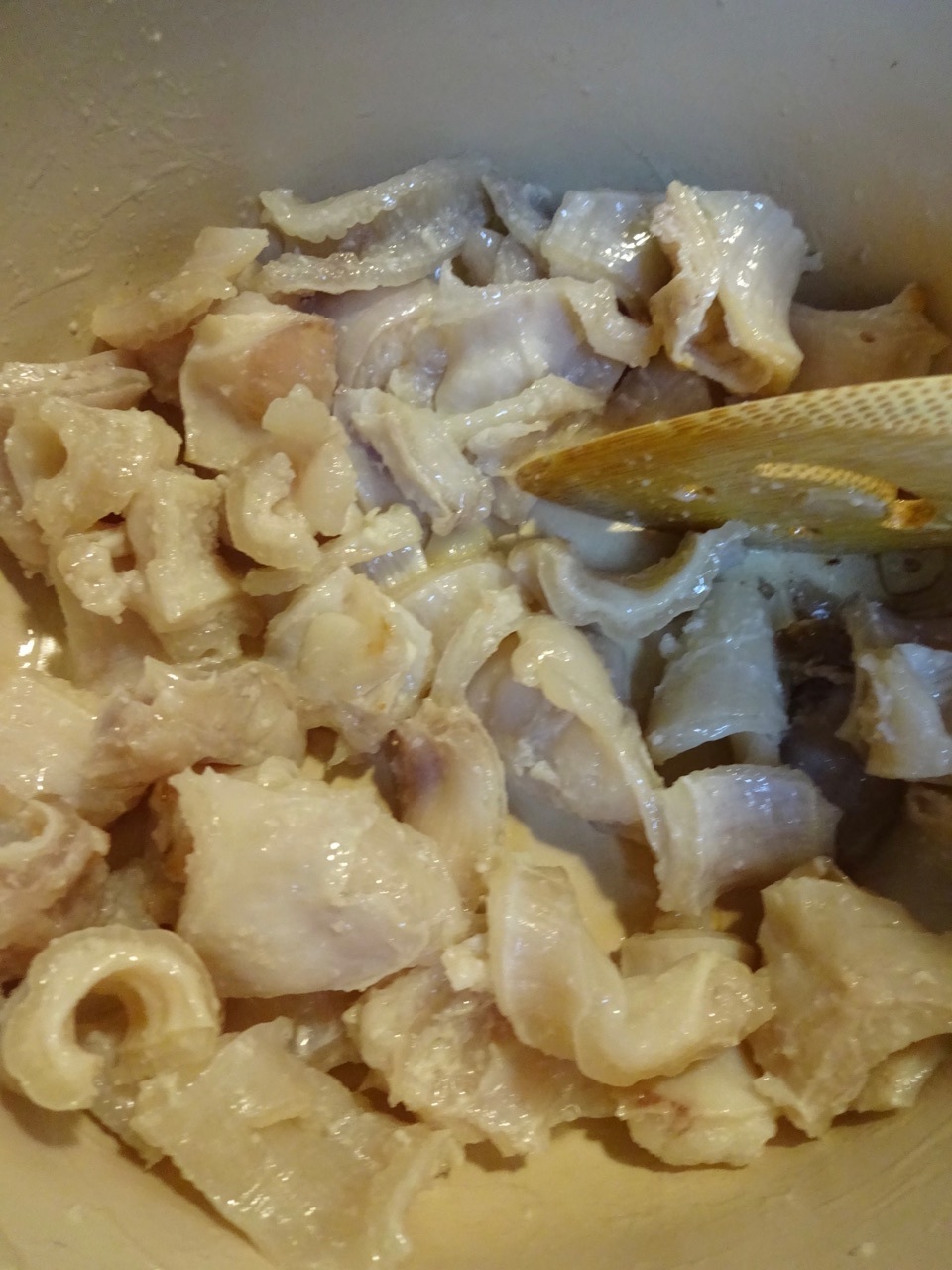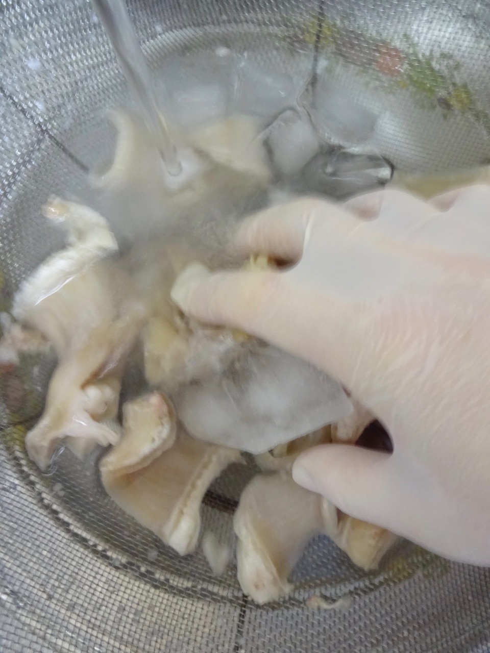 【下準備】牛スジは金ザルに置いて熱湯を注いだ後、水で洗いながら脂や血を取り除き、最後に氷水で洗って締め、食べやすい大きさに切る。キッチンペーパーで水気を拭いてポリ袋に入れ、塩麹を加えて半日漬ける。