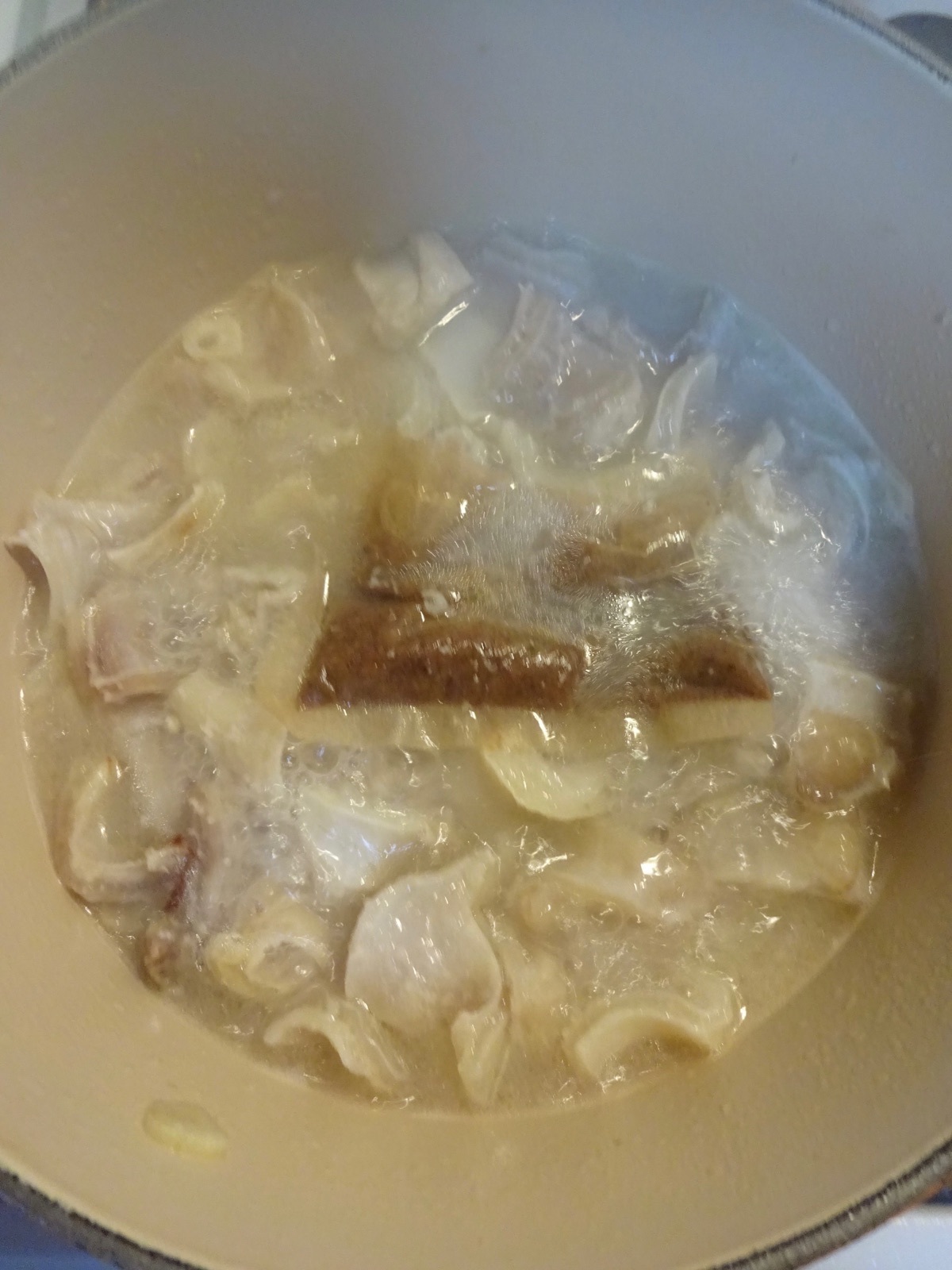鍋に菜種油を入れて中火にかけ、にんにくを0.3cmの輪切りにして加え、にんにくの香りが立ち始めたら火を弱めて牛スジを入れる。表面に火が通るまで炒めたら再び中火にして水を注ぎ、煮立ったらアクを取る。