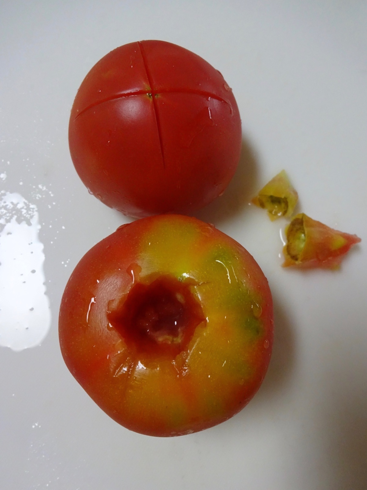 トマトの芯をくり抜き、上部に十字の切り込みを入れる。