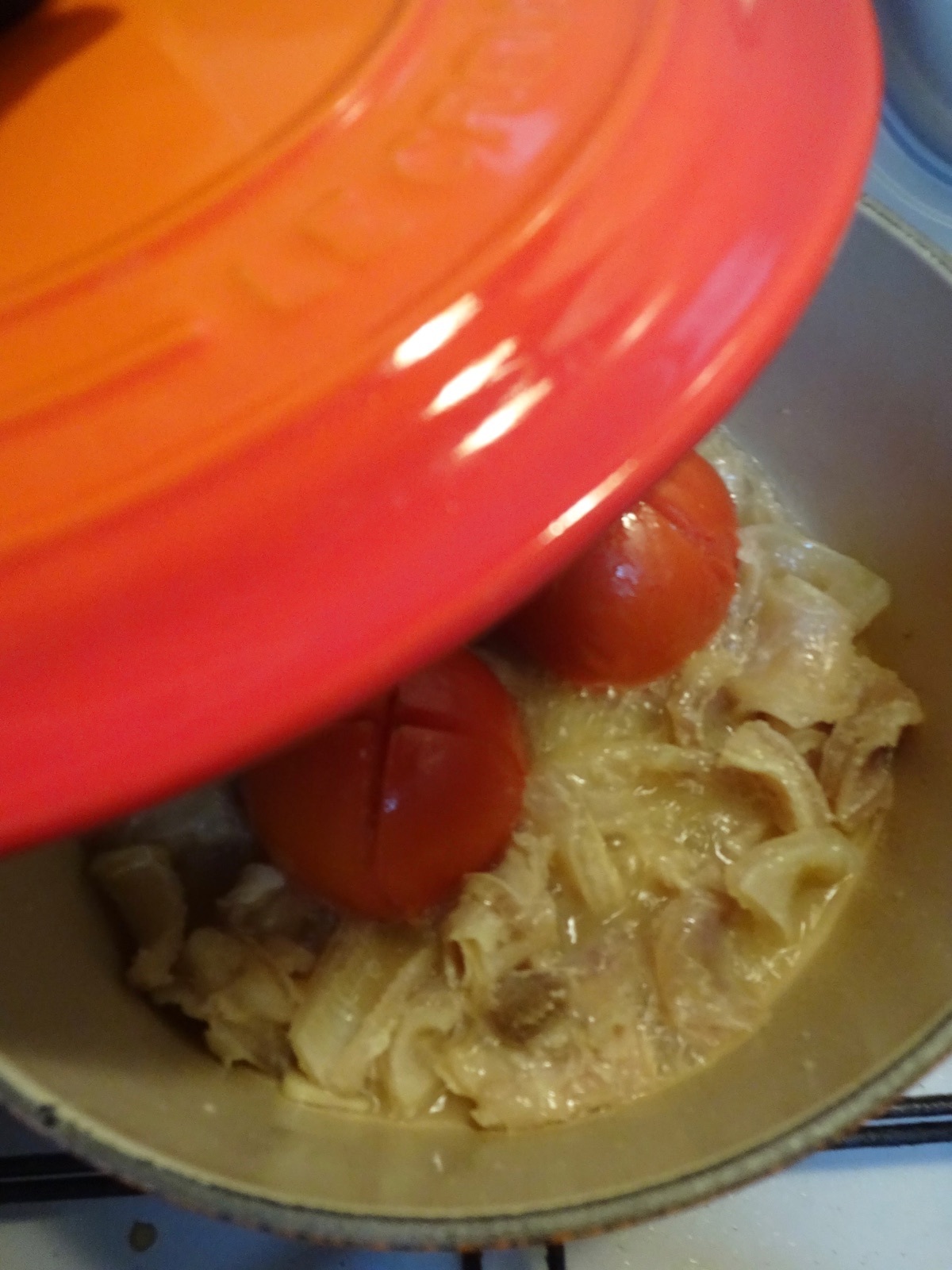 3にトマトを加えて鍋の蓋をして火を弱め、全体に味がしみて牛スジが柔らかくなるまで約40分煮て火を止める。蓋をしたまま20分置いて味を落ち着かせる。