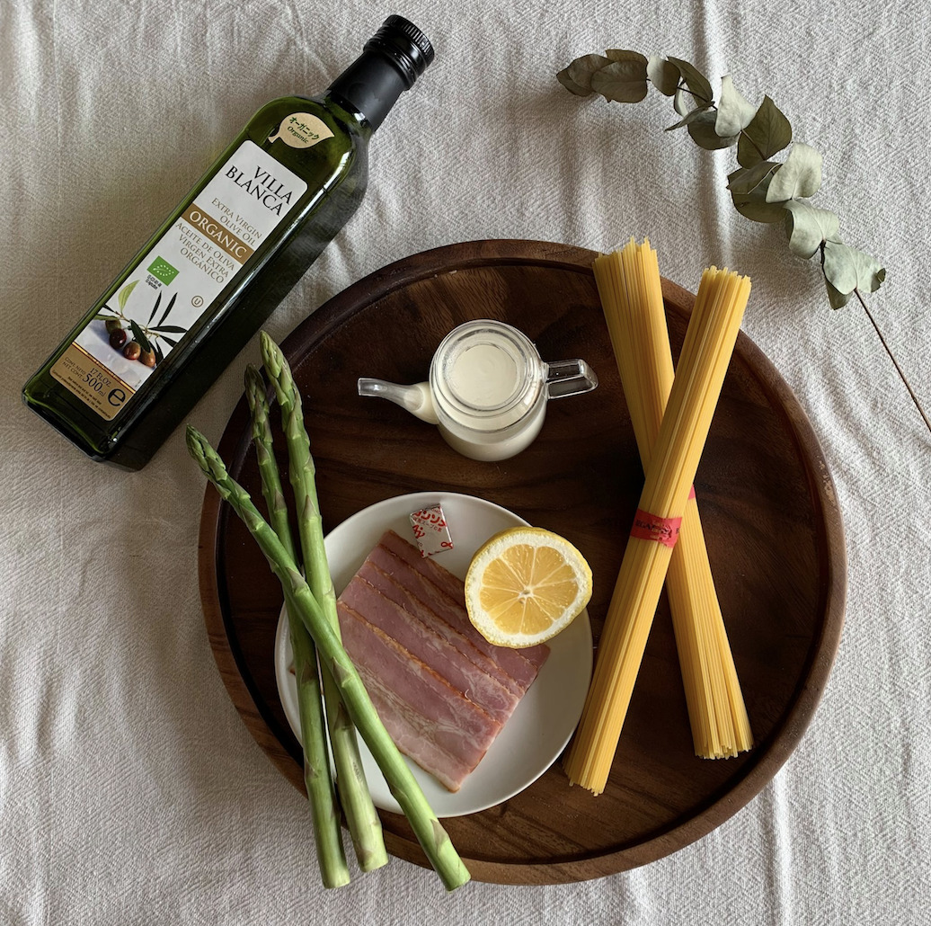 - フライパンにオリーブオイルを引いて中火に熱し、ベーコンを入れて炒めます。軽く焼き色がついたら、アスパラガスを加えてさらに1分ほど炒めます。
