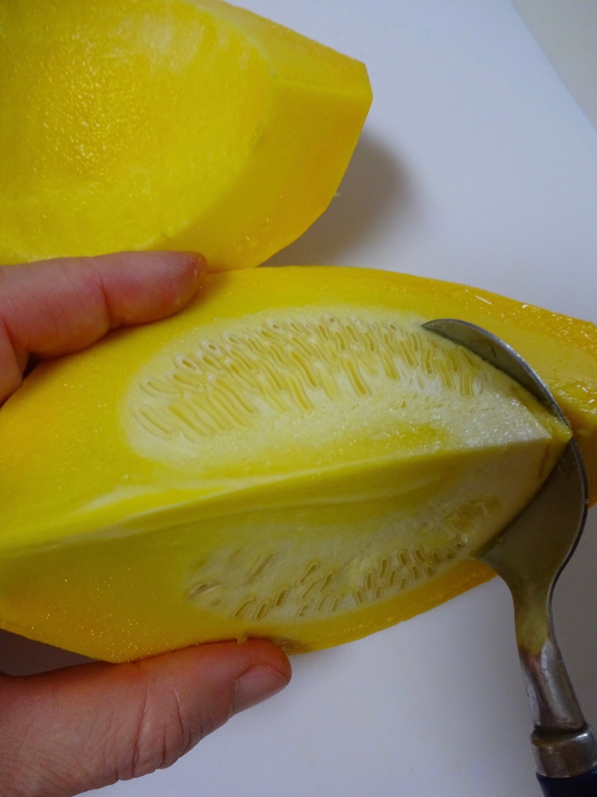 コリンキーは半分に切り、更に半分にしてからワタを取り除く。