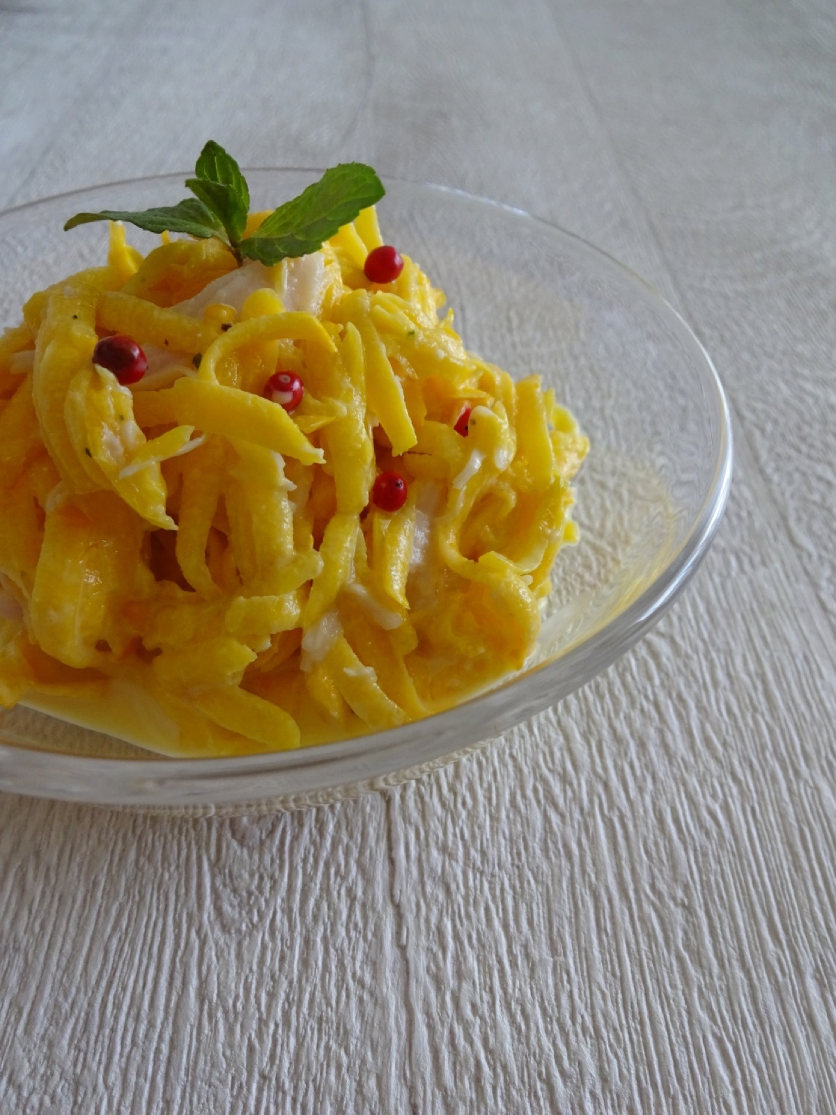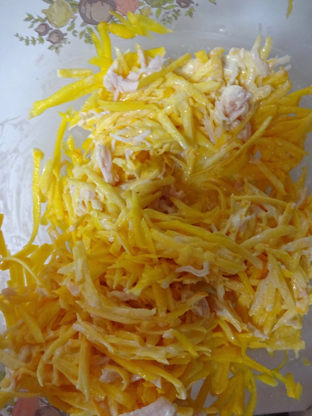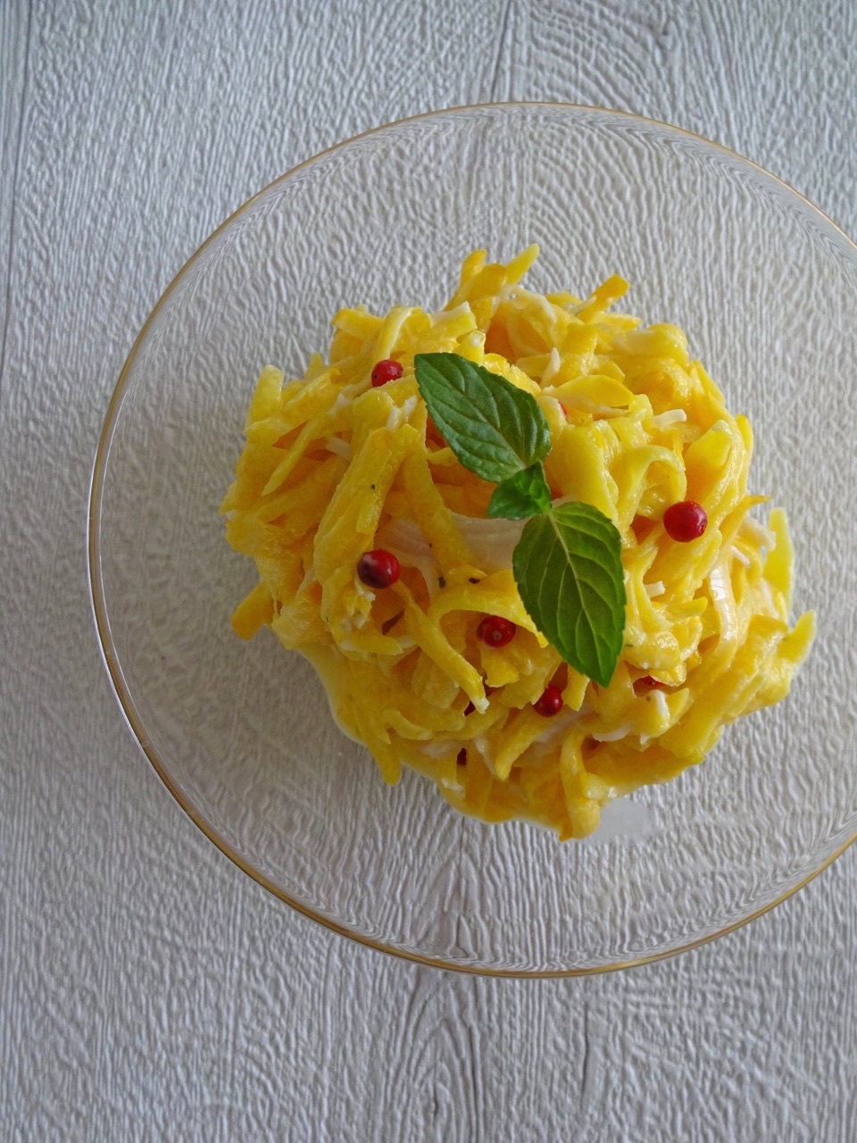 皮ごと生食出来る黄色い南瓜コリンキーと味付きの鶏ささみ缶を使ったヘルシーな時短コールスローサラダです。コリンキーのシャキシャキした食感に鶏ささみのしっとりした食感を合わせた、さっぱり味のひんやり夏レシピ。