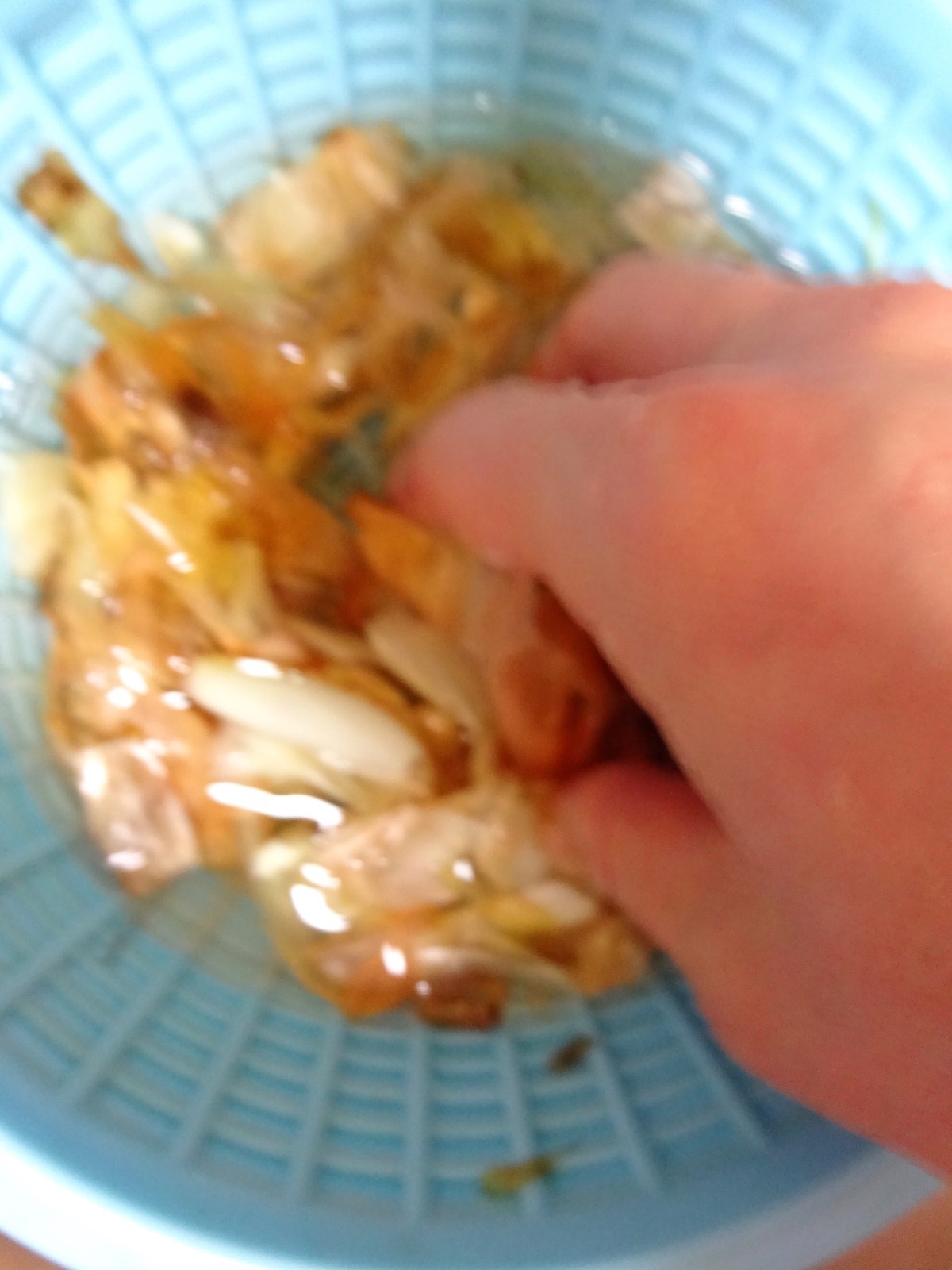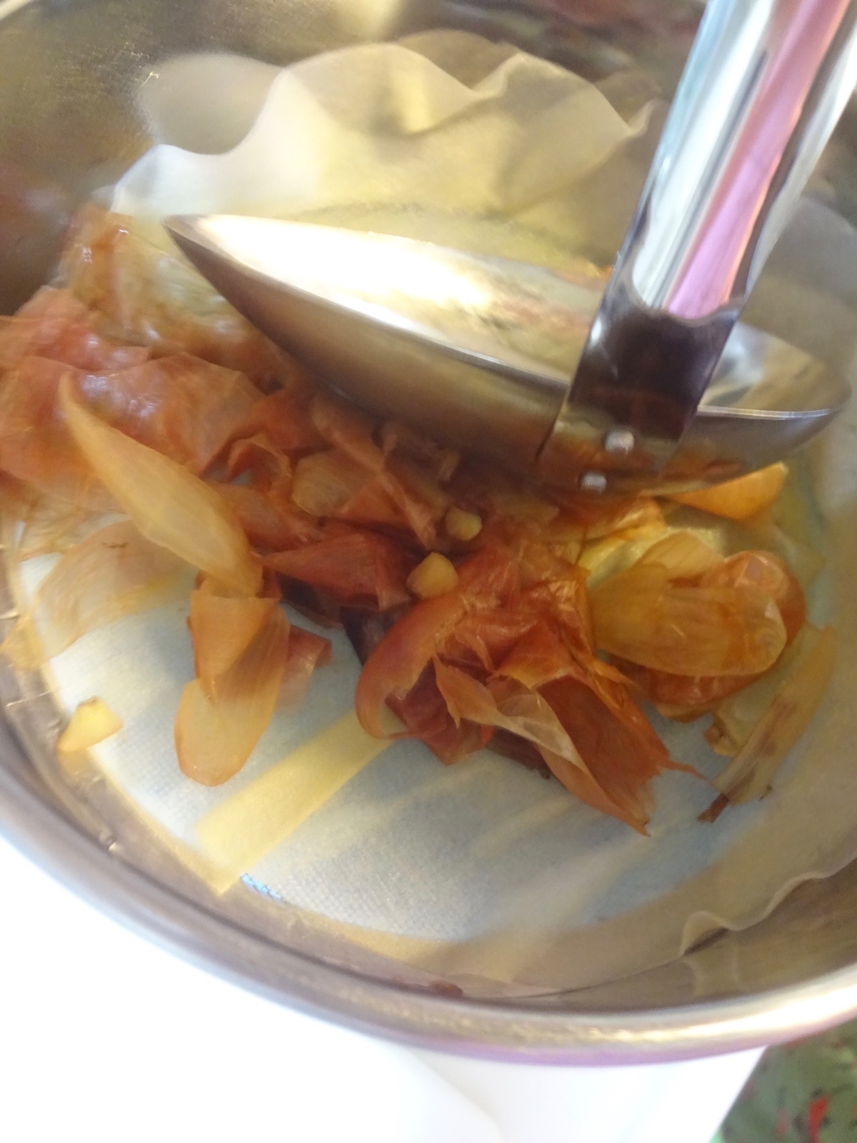 玉ねぎの皮と水を鍋に入れて中火にかけ、沸騰後10分煮て、液をこす。