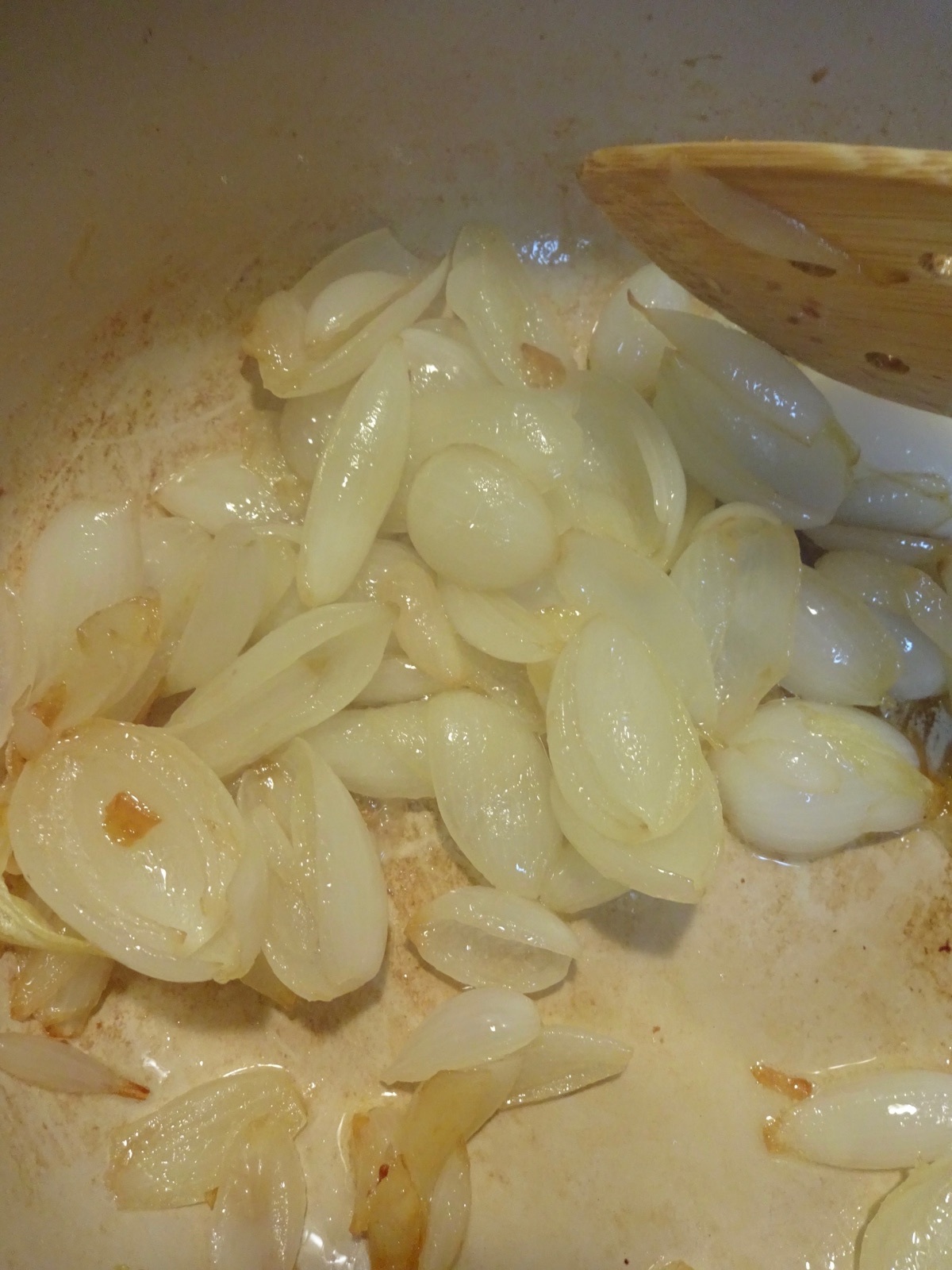 鍋にバターを入れて中火にかけ、バターが溶けたら玉ねぎとにんにくを加えて弱火にし、玉ねぎがしんなりとするまでまで炒める。