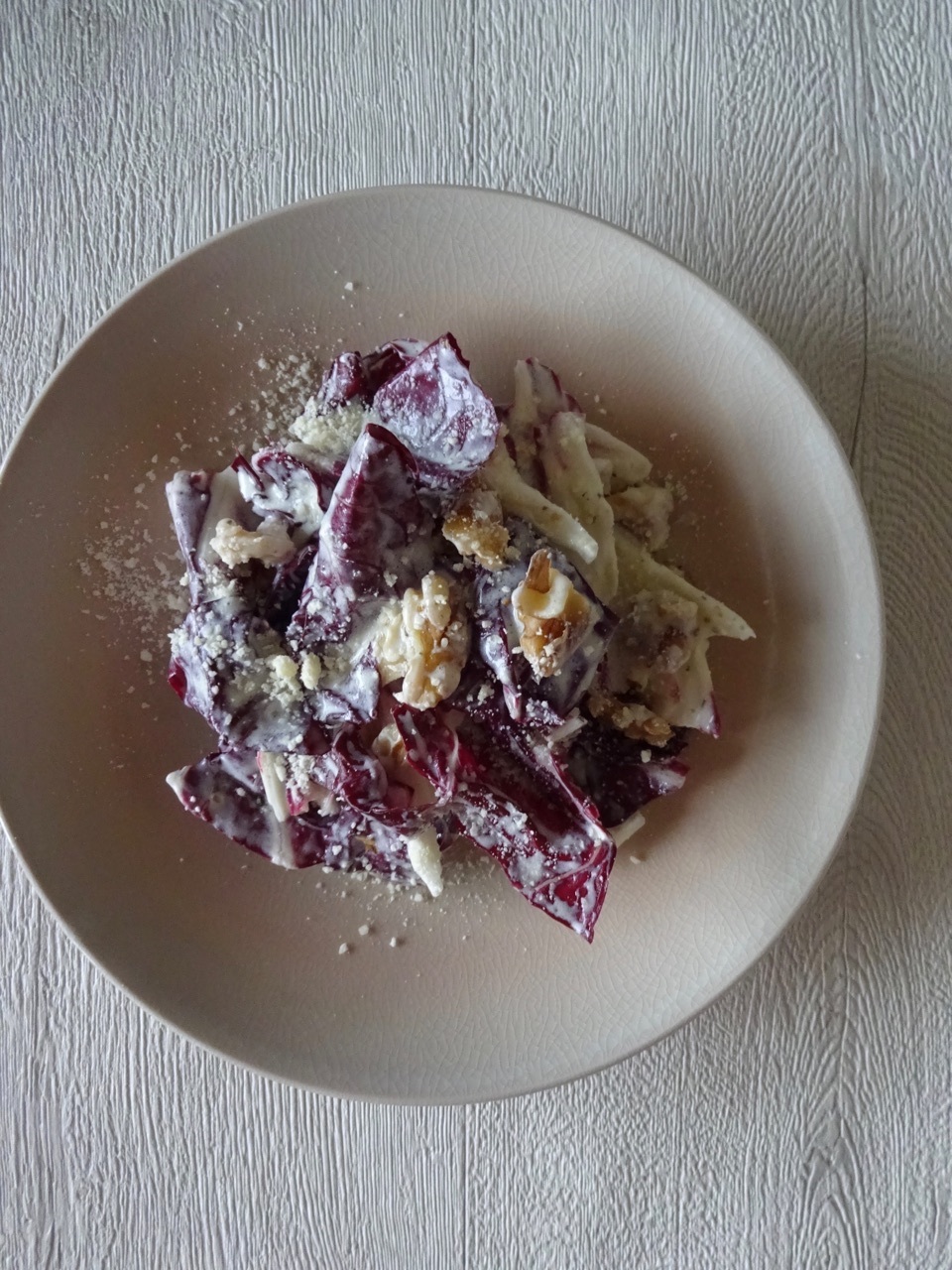 赤と白のコントラストが美しく、少し苦味のある野菜トレビスをくるみと一緒にヨーグルトベースのソースで和えたスタイリッシュなサラダです。アクセントに粉チーズを振りかけ、さっぱりとしながらも食べ応えのある、お酒にも合うレシピです。