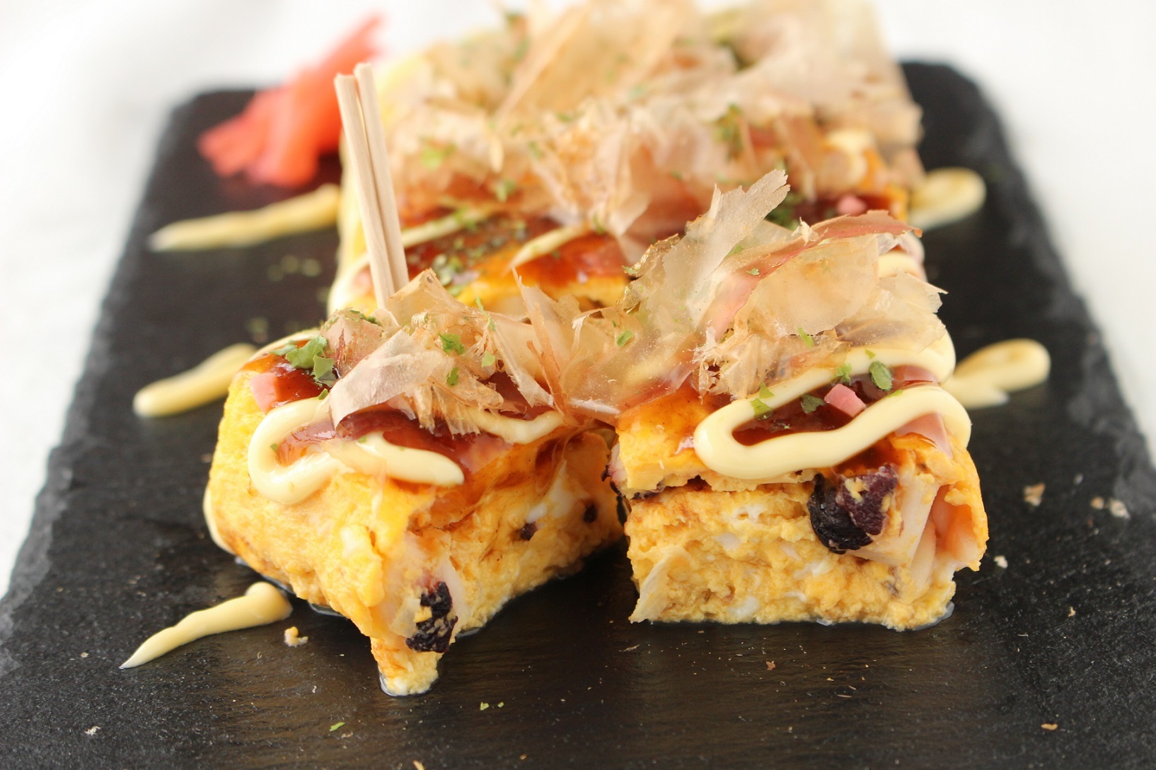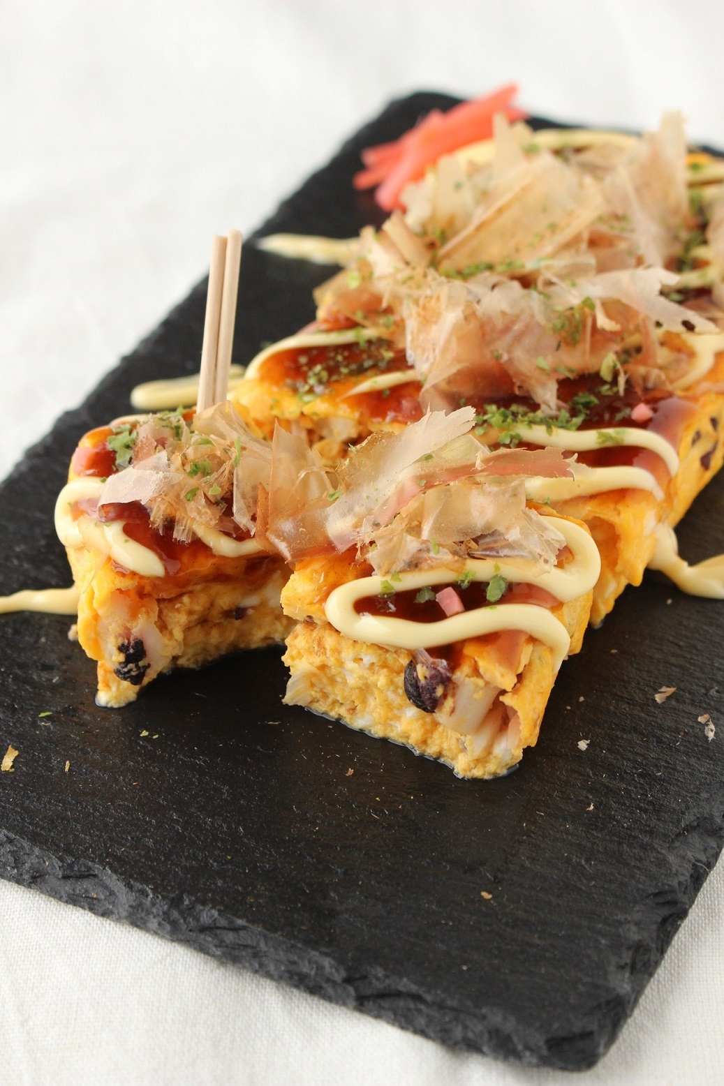 おつまみにもなる変わり卵焼き。ふわふわの卵にタコの旨み。ソースとマヨネーズをかけて、たこ焼き風の味わいに。ひと口サイズに切れば見た目もたこ焼きに。