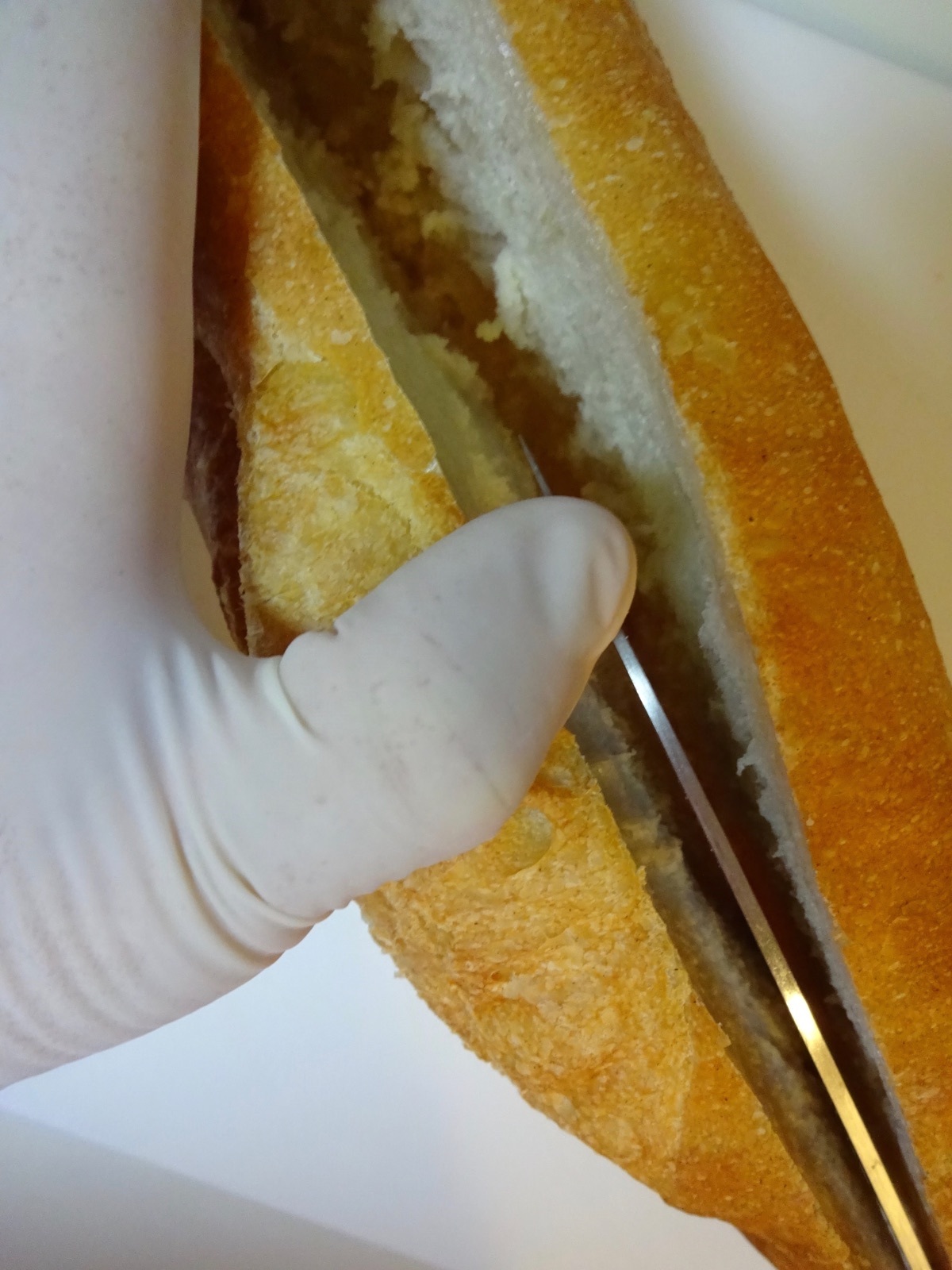 【下準備】パンは具材をはさみやすい4/5程度の切り込みを縦に入れる。ピクルスは約0.5cm厚に縦にスライスする。