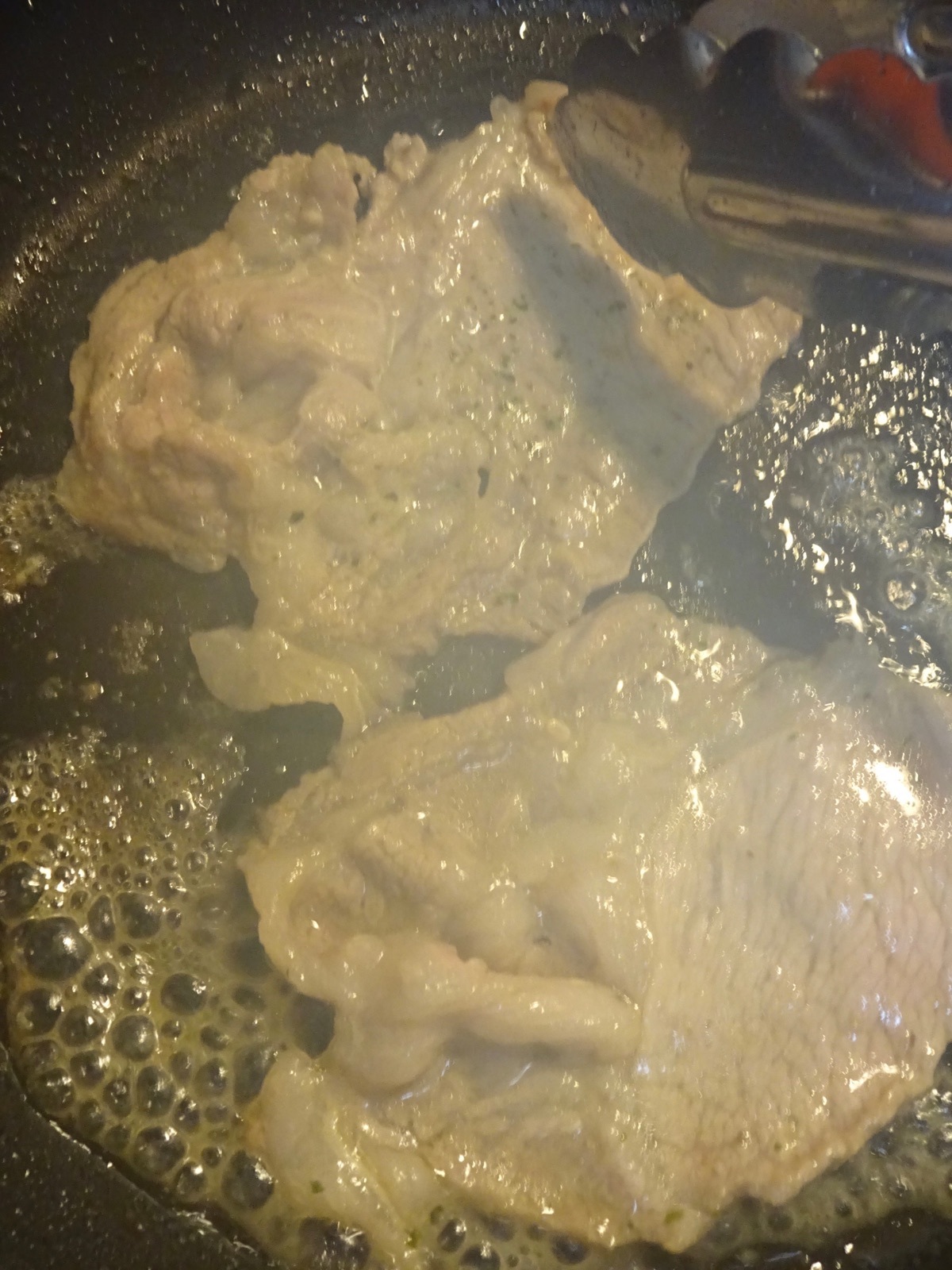 フライパンにオリーブオイルを入れて中火にかけ、豚肩ロースの液を切って加え、火が通るまで上下返しながら焼く。