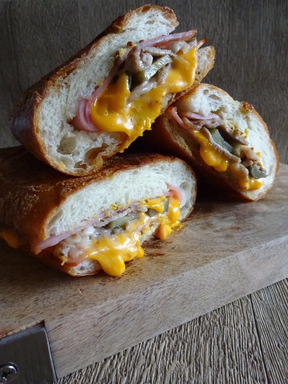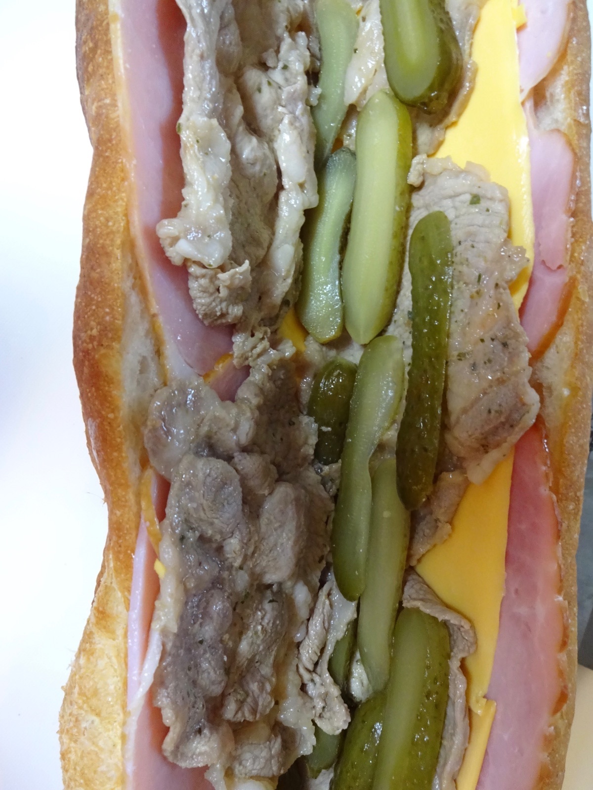 パンの切り口を広げ、マスタードを両内側に塗り、ハム→チーズ→豚肩ロース→ピクルスの順にはさむ。
