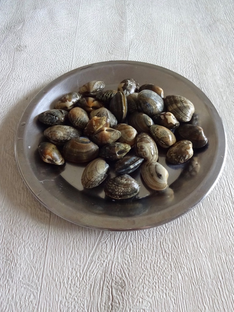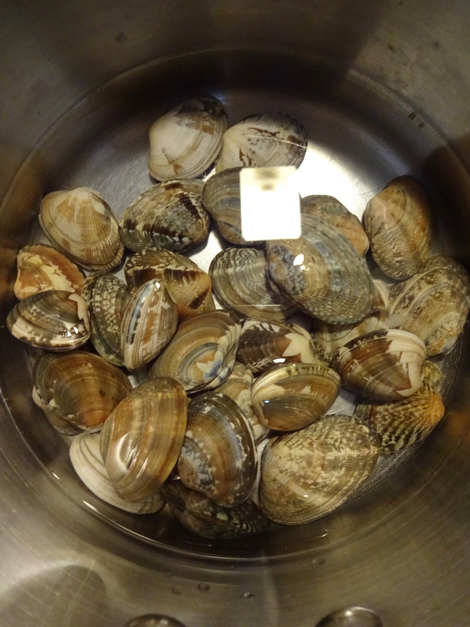 【下準備】あさりは3%の塩水に1時間浸けて砂出ししてよく洗い、ザルに上げて水気を切る。