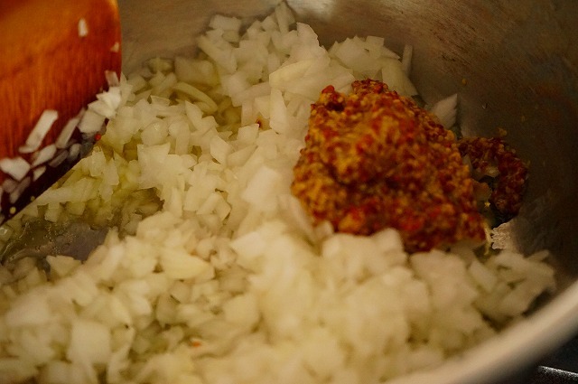 鍋にサラダ油を入れ熱し玉ねぎ・粒マスタードを入れ中火できつね色になるまで炒める。