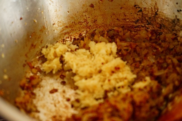 しょうが・にんにくを入れ青臭さが無くなるまで弱めの中火で炒め、Aのスパイス・塩を入れ弱火で香りが立つまで炒める。