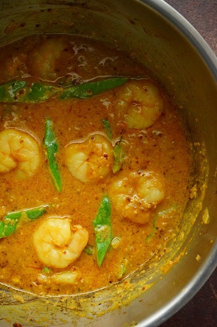 - ココナッツミルク・水を入れ中火でトロっとするまで煮込み、むき海老・モロッコいんげんを入れ5分ほど煮込む。