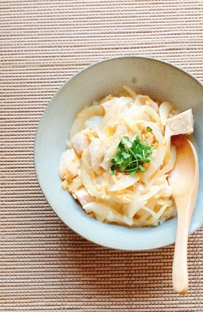 フライパンに、お湯、めんつゆ、1を入れ中火にかけ、玉ねぎがしんなりしたら、中火のまま溶き卵を回し入れる。