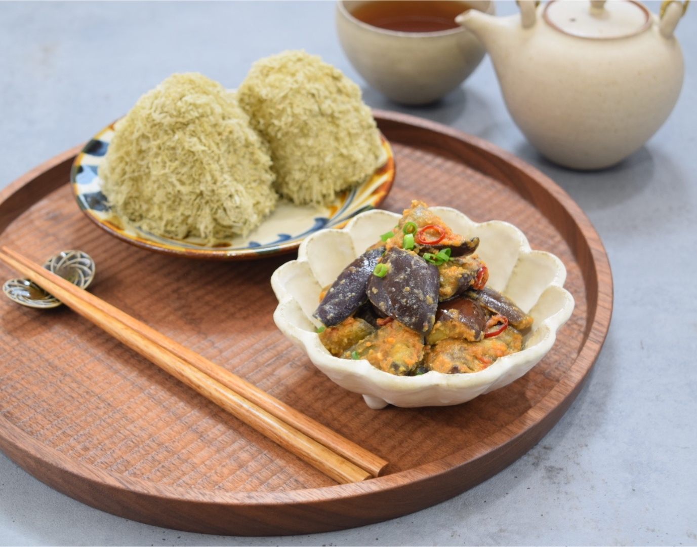 - フライパンにごま油を入れて加熱し、輪切り唐辛子、ナスを炒める。油が全体にまわったら、合わせ調味料を加えて全体に絡める。