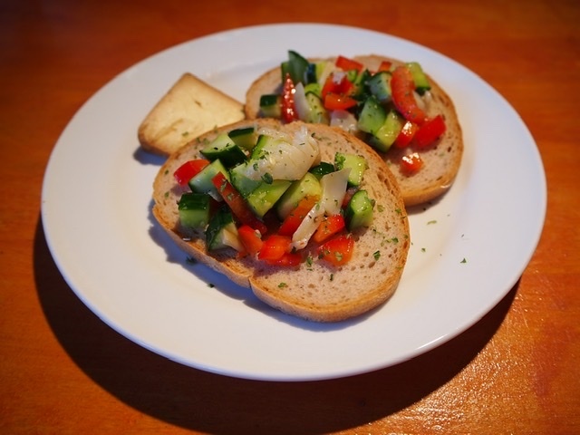 きゅうりは軽く塩をし10分ほどおき、水気を絞っておく。スモーク帆立、きゅうり、パプリカを粗みじん切りにする。
