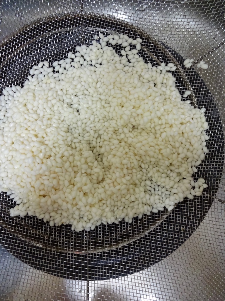 【下準備】もち米は水が透明になるまで研ぎ、30分浸水させてザルに上げて水気を切る。