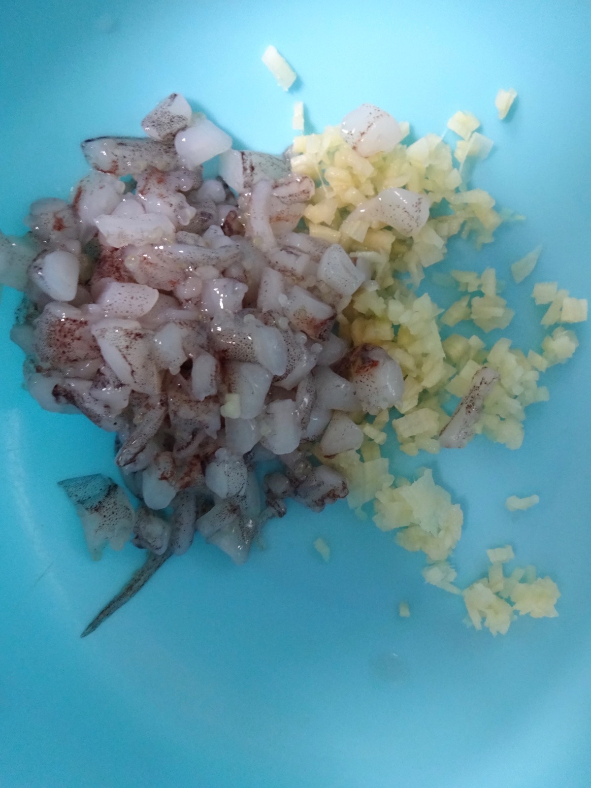 【下準備】いかの足と生姜をみじん切りにする。